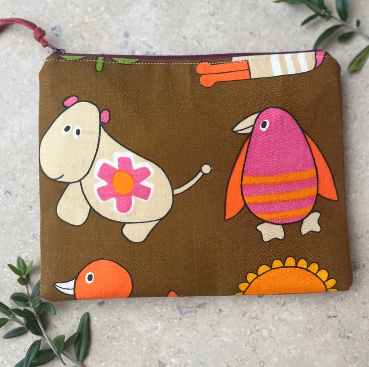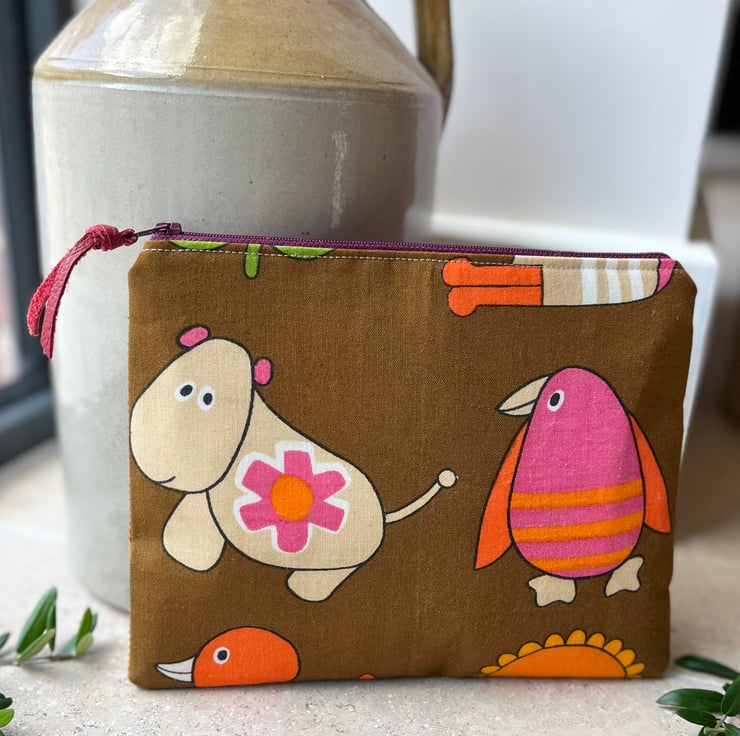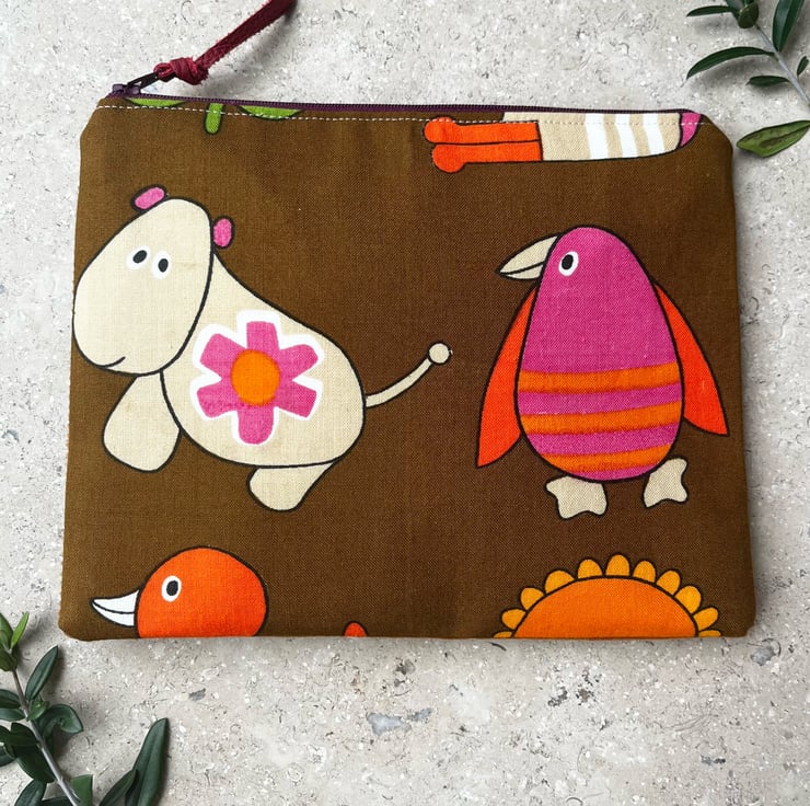 Cute retro animal zip pouch with corduroy back. This little bag has been made from vintage Frieda Clowes design cotton with bright animals on a brown background.
