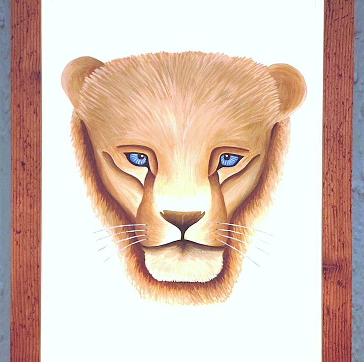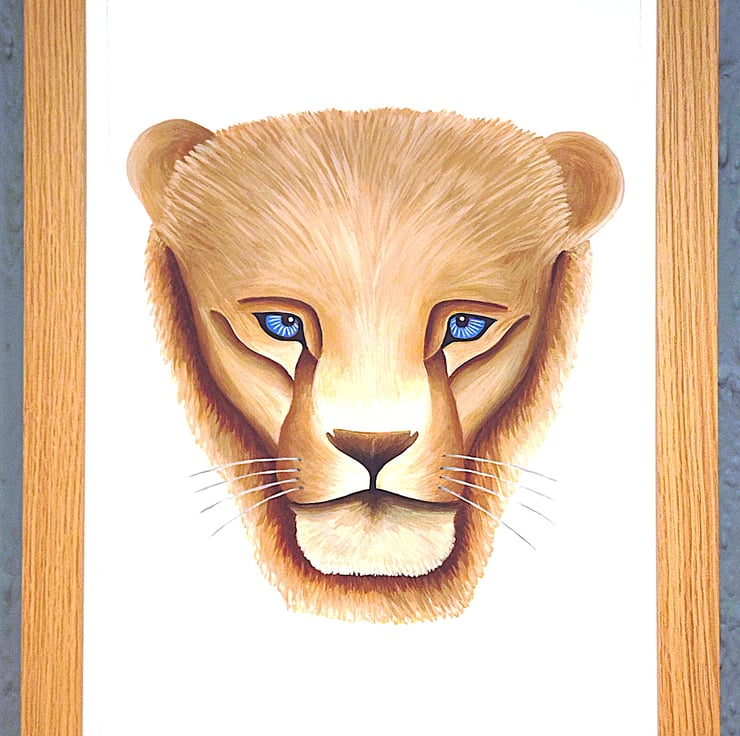 Framed high-quality coloured A3(42cm x 30cm) Giclee print of my painting of a lion's head/portrait on a white background with a hard backing. The print comes finished with a stylish, contemporary white border. Framed with an expensive Styrene Protective Perspex (which has same clarity of glass) ready to hang. Buyer can choose from three types of frame; Black, Oak or Dark Oak. Colours of print with border may differ slightly due to computer/phone settings. All purchases delivered within 7-10 working days.