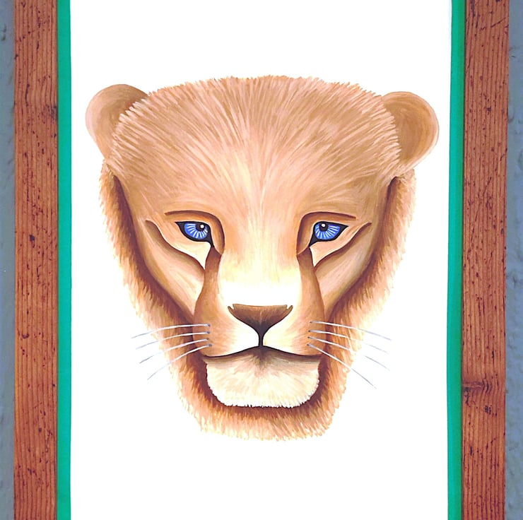 Framed high-quality coloured A3(42cm x 30cm) Giclee print of my painting of a lion's head/portrait on a white background with a hard backing. The print comes finished with a stylish, contemporary dark green border. Framed with an expensive Styrene Protective Perspex (which has same clarity of glass) ready to hang. Buyer can choose from three types of frame; Black, Oak or Dark Oak. Colours of print with border may differ slightly due to computer/phone settings. All purchases delivered within 7-10 working days.