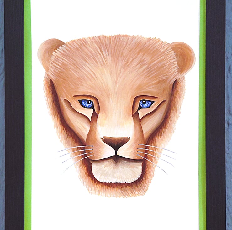 Framed high-quality coloured A3(42cm x 30cm) Giclee print of my painting of a lion's head/portrait on a white background with a hard backing. The print comes finished with a stylish, contemporary light green border. Framed with an expensive Styrene Protective Perspex (which has same clarity of glass) ready to hang. Buyer can choose from three types of frame; Black, Oak or Dark Oak. Colours of print with border may differ slightly due to computer/phone settings. All purchases delivered within 7-10 working days.