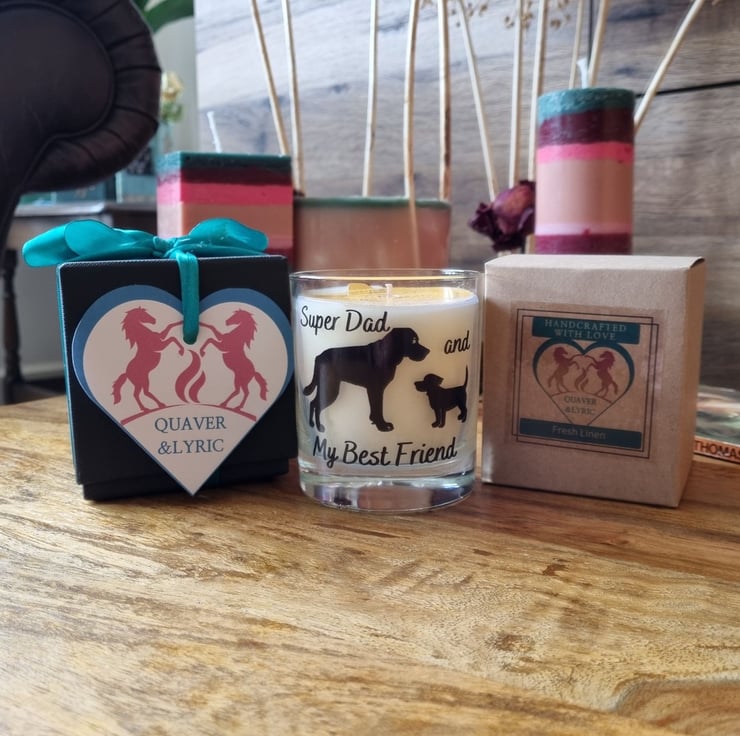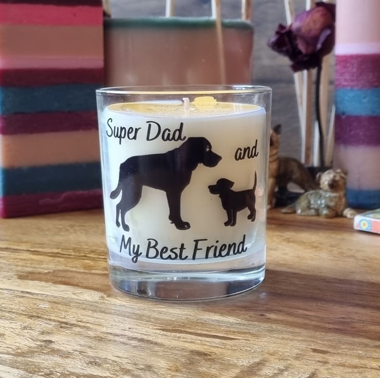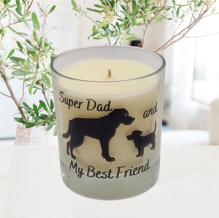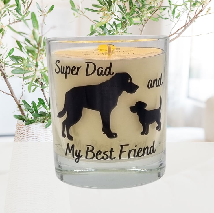 A scented candle with a black vinyl dog and puppy design and caption Super Dad and My Best Friend. Lovely gift for father's day or for a Dad's birthday. Handmade using high quality rapeseed and coconut wax blend, the finest range of premium fragrances, poured into quality glass containers and supplied in a kraft box. The design on the scented candle is made from permanent waterproof printed vinyl which can be cleaned (hand wash only) allowing the glass to be re-purposed as part of your home decor after the candle has burned.