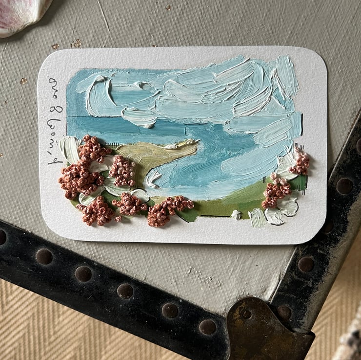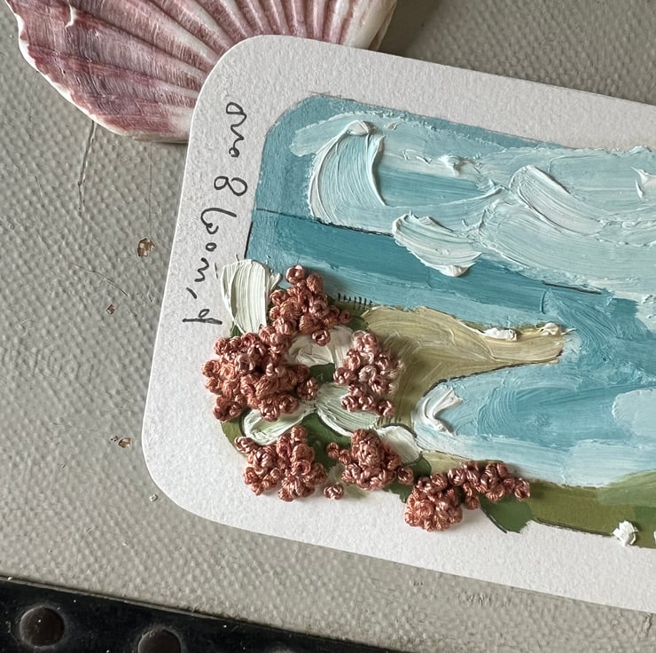 Layer upon layer of oils, pencil and then embroidery to create a coastal scene,