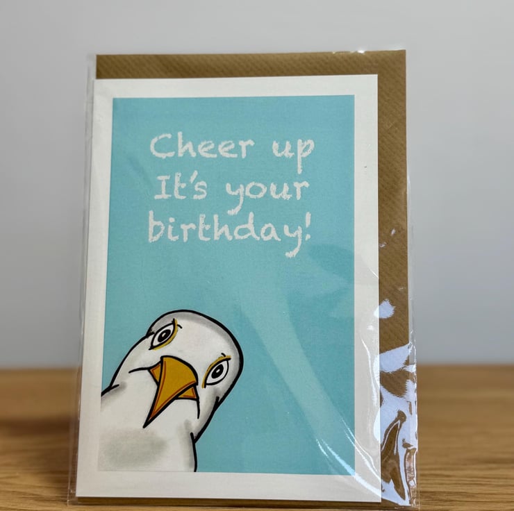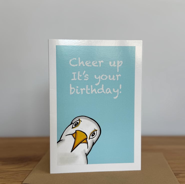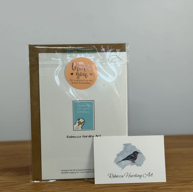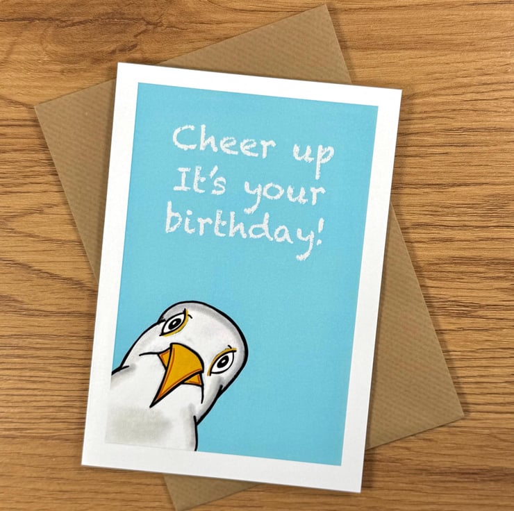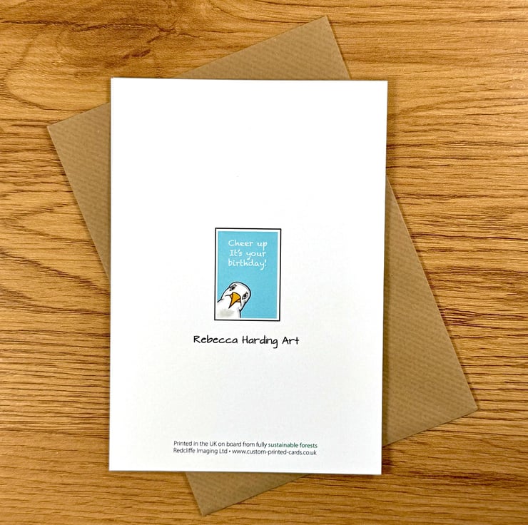 A hand drawn blank card. Hand drawn chip stealing Seagull. An orginal card design.
