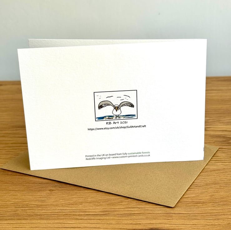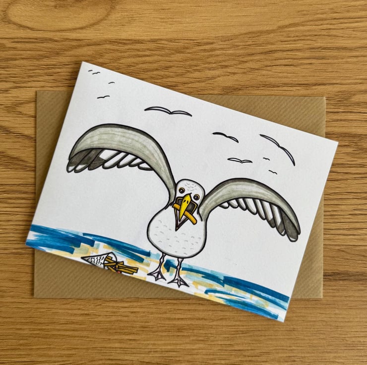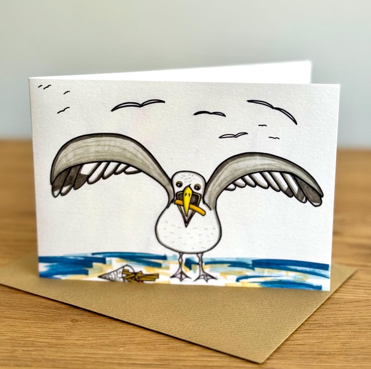 A hand drawn blank card. Hand drawn chip stealing Seagull. An orginal card design.
