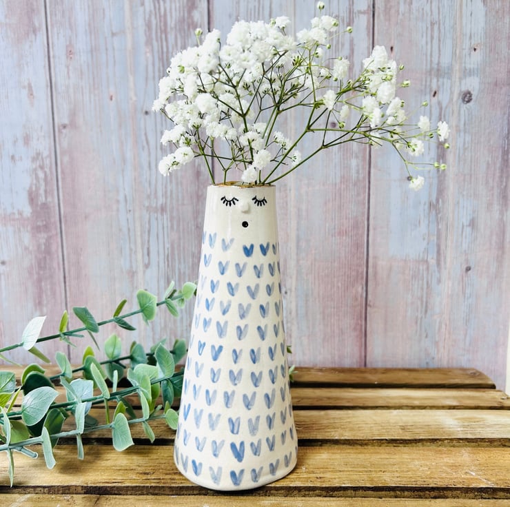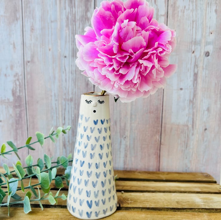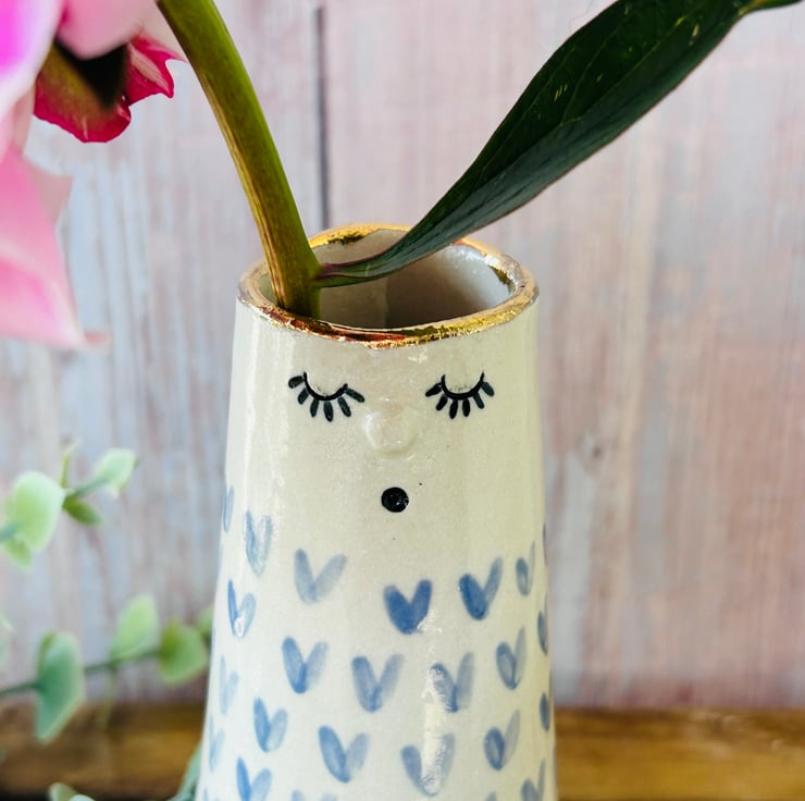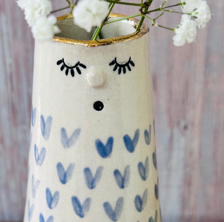 Each vase is made using the slab building technique. I add their faces then color/carve and decorate them making each one totally unique. They are all finished with a 24k gold lustre rim and some have the addition of more gold on their bodies.