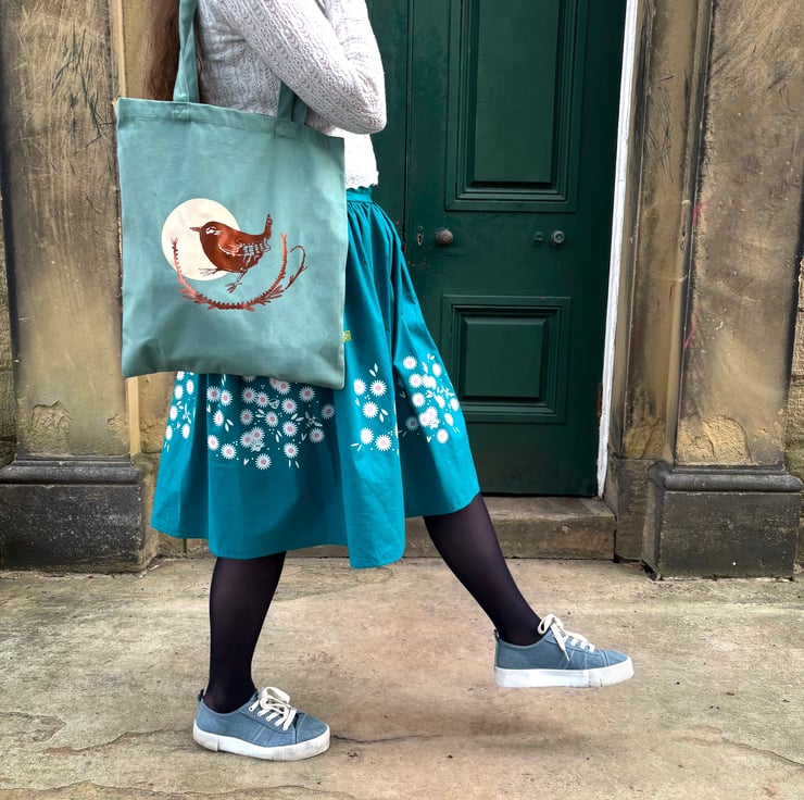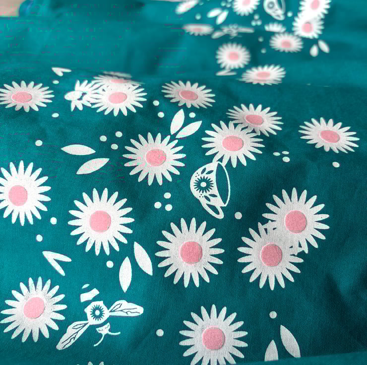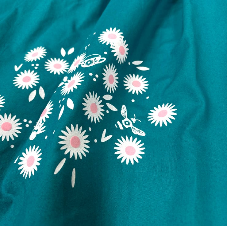 This skirt is made using a mid-weight cotton poplin and features my daisy illustration. The print was screenprinted from our Yorkshire home and I've added flock highlights to form the flora centres in soft pink flock. Features two hidden side pockets in the colour of the flower centres and an elasticated waistband at the back.