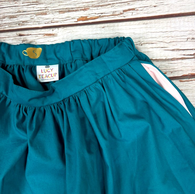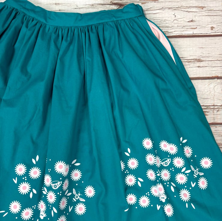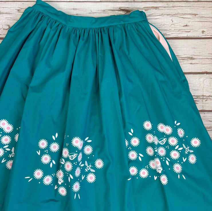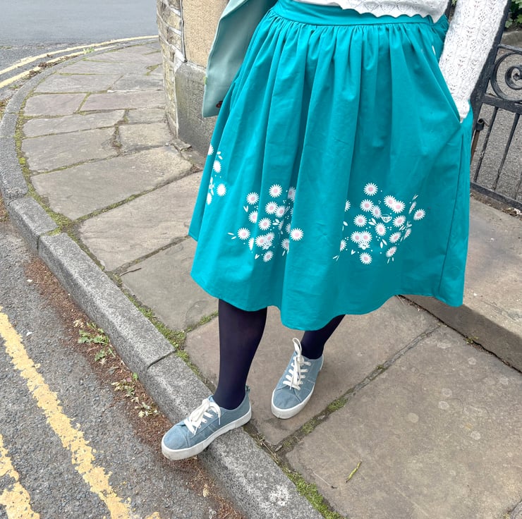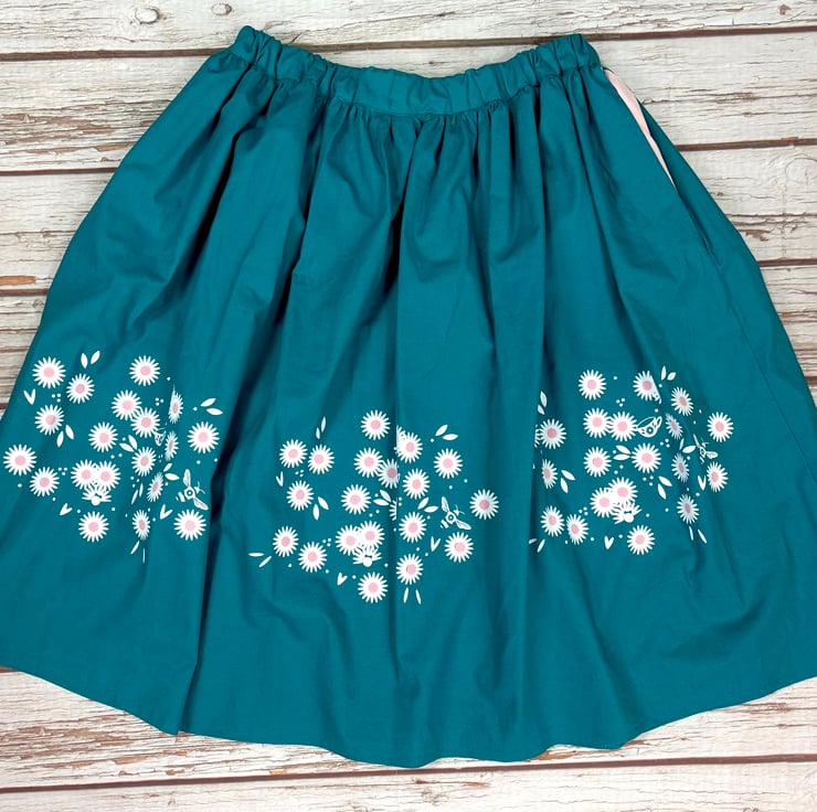 Summer Daisy Print Skirt. Teal cotton Elasticated waistband and Pockets