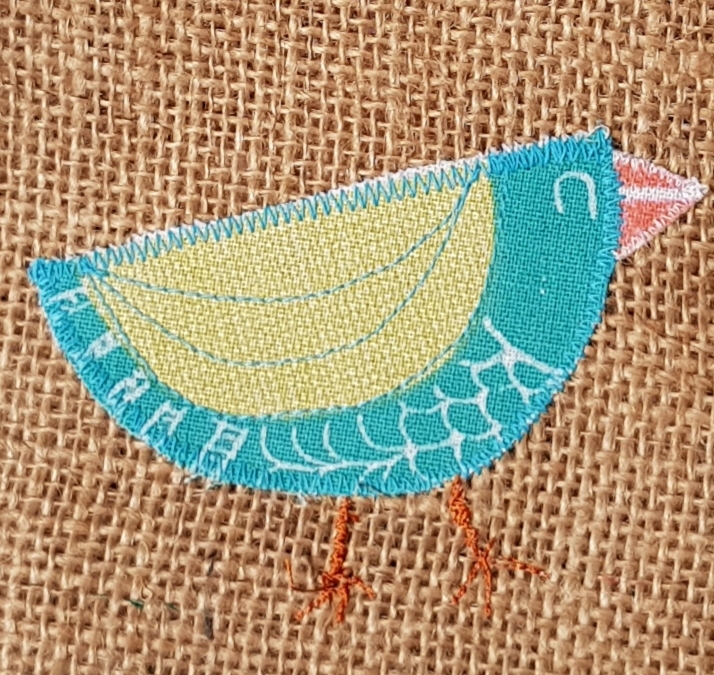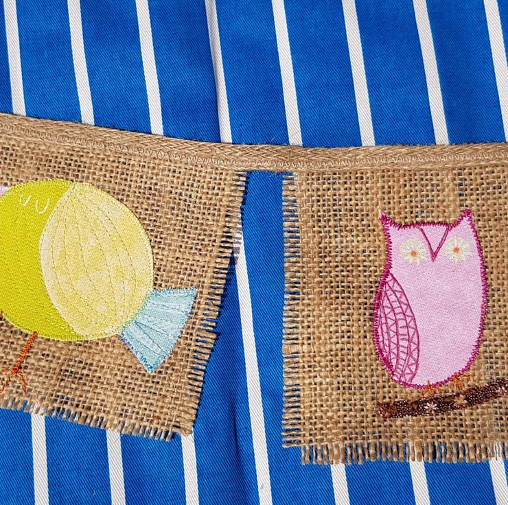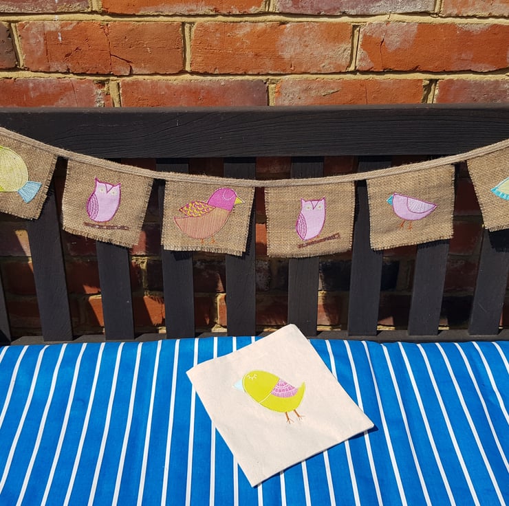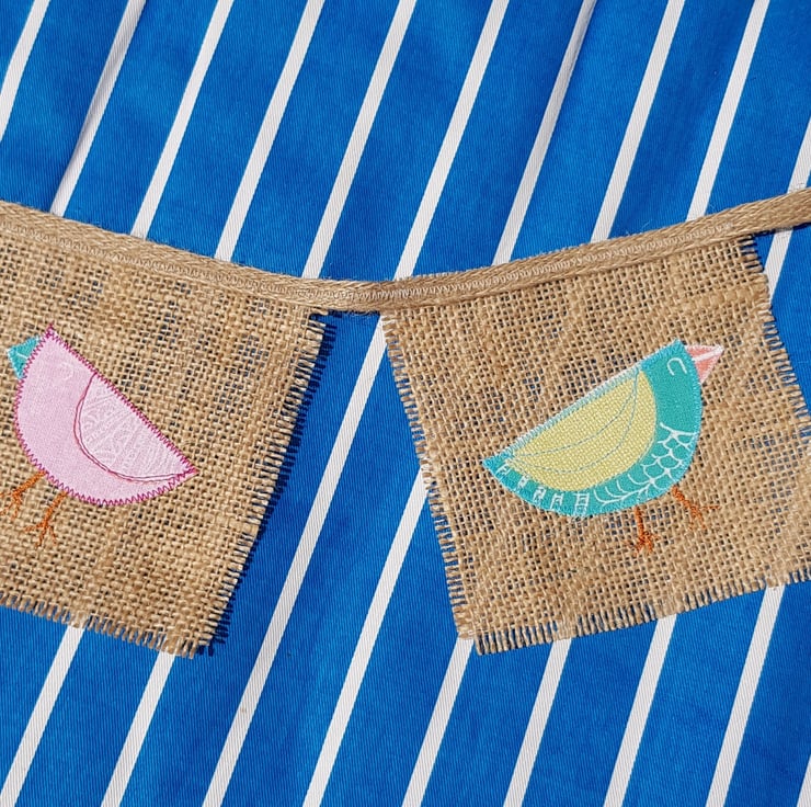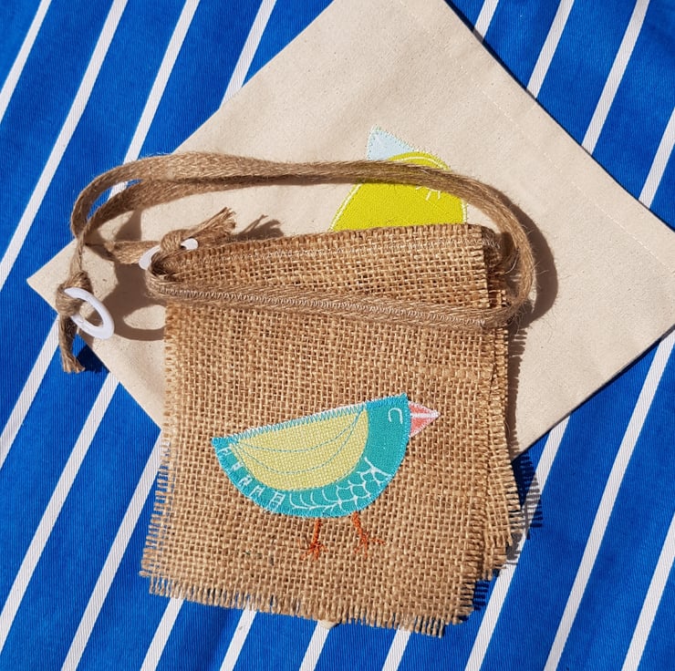 Consisting of 6 hessian squares onto which I have stitched little fabric birds left from remnants of fabric I found in a charity shop. Each square is approx 5" / 13cm. They are joined by approx 1.25m of jute tape. I have added some little rings (these are often used in fabric bundles so I would rather find a use for them than throw them away) .