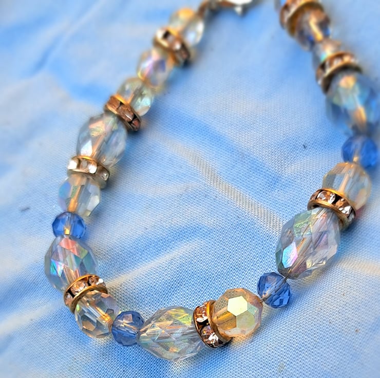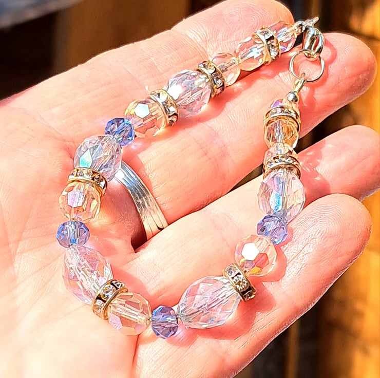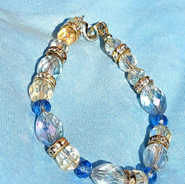 A lovely sparkly blue and clear crystal gemstone wired bracelet with sparkly dimante spacers.