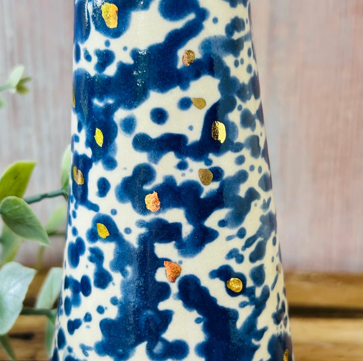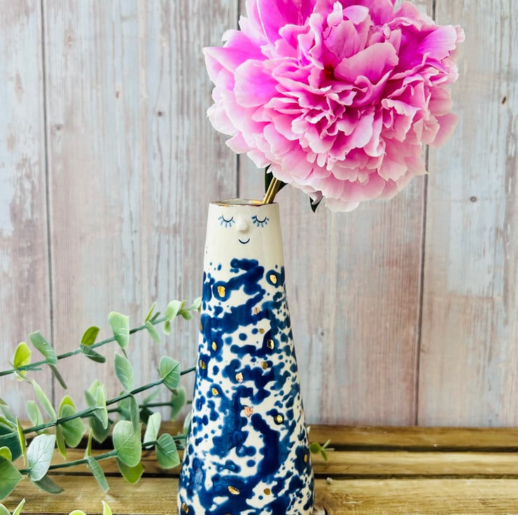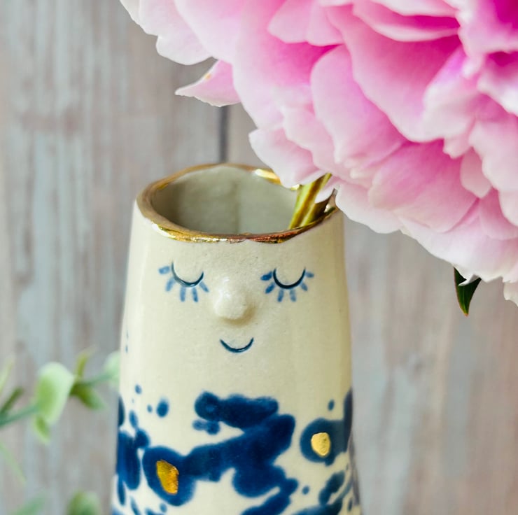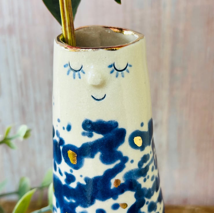 Each vase is made using the slab building technique. I add their faces then color/carve and decorate them making each one totally unique. They are all finished with a 24k gold lustre rim and some have the addition of more gold on their bodies.