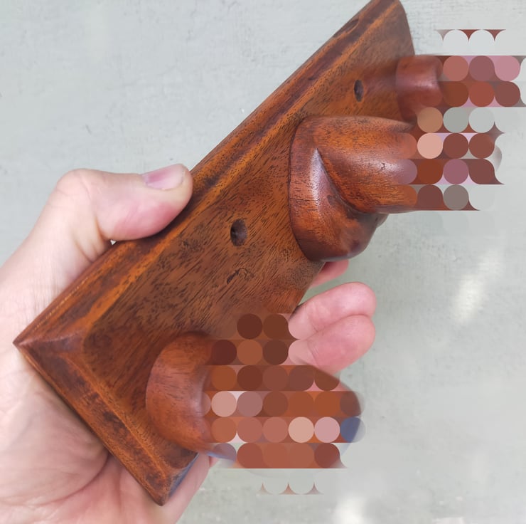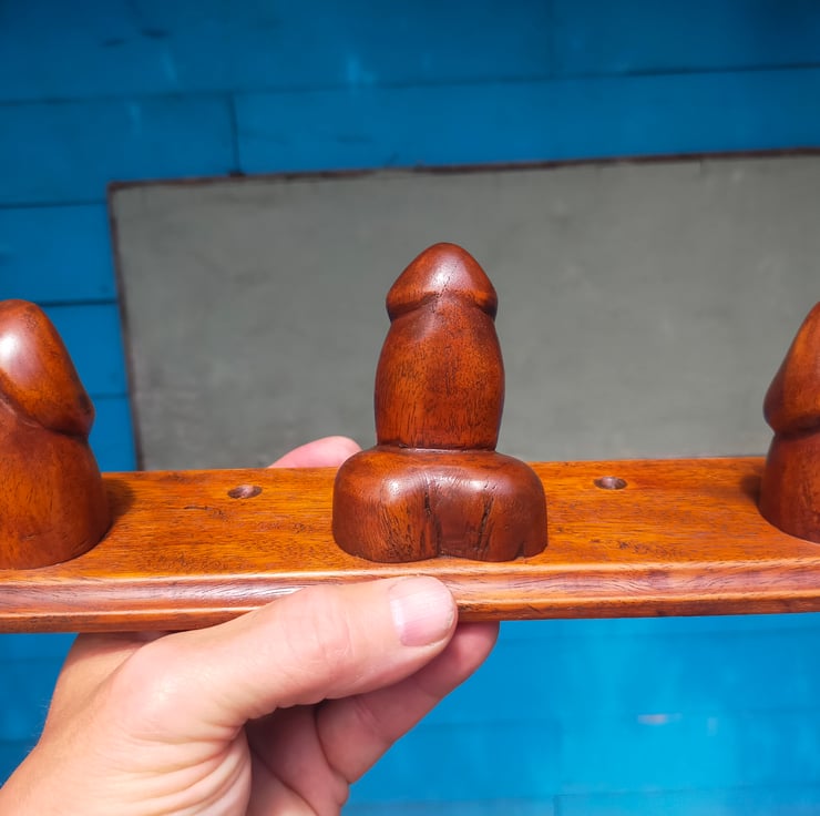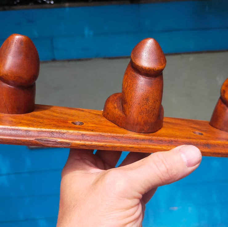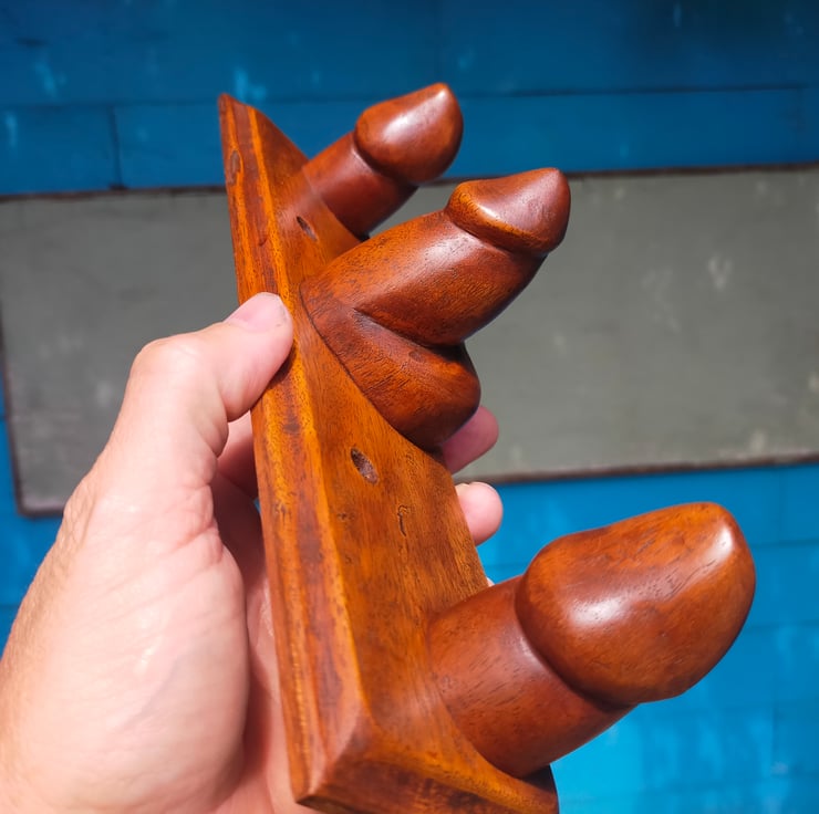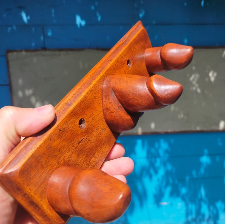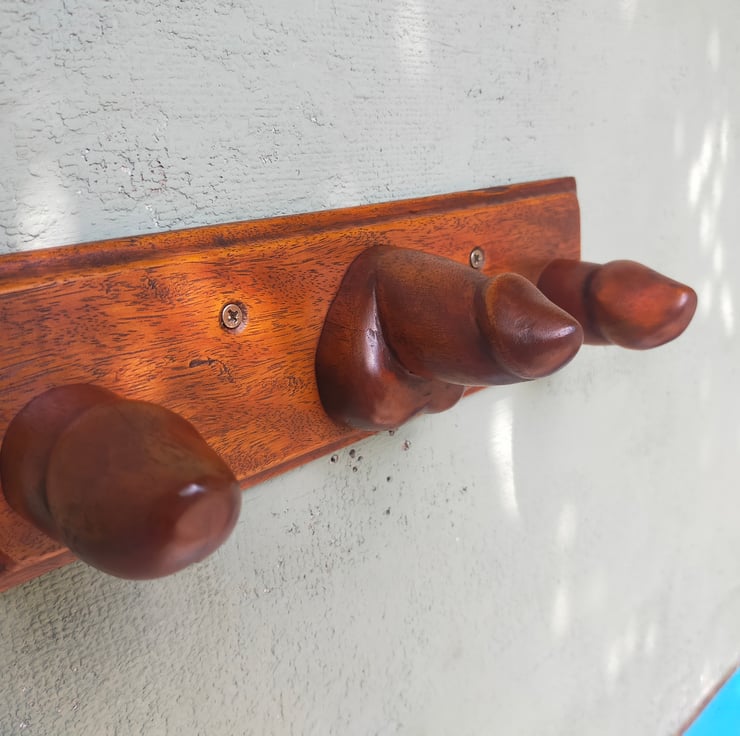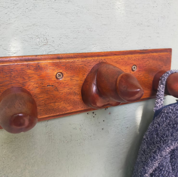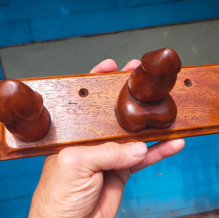 Want something a little more interesting to hang your dressing gown, bath robe or towel on? My novel hooks are designed for the bedroom or bathroom door of the more adventurous. Each appendage is individually hand-carved from reclaimed mahogany, sanded, stained, polished and waxed, and firmly screwed and glued to a mahogany backplate. The backplates are all different sizes as I have had to cut around the many nail holes in the original timber, so please do check dimensions carefully. The entire range of Choads, Packets, Stiffies and Shrooms is hand-carved from Brazilian mahogany - now a rare and protected timber - but reclaimed from a farm near Clitheroe, built in the 1950s. This timber served its purpose as the rafters of a barn, but is now living again as a limited run of cheeky household sculptures. As can be seen from the reverse pics, the timber is a light reddish brown but I wanted to create a darker and more distressed patina: I wanted these pieces to look like they had been recovered from an abandoned Victorian molly house. None is perfect: all have some flaw or other, and I have tried to highlight those in the photos. After all, if they were all identical how could you have a favourite? Each of this limited run has been named, numbered and signed by myself to make them even more unique.