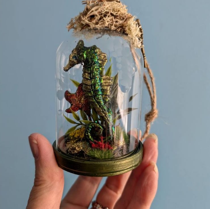 The seahorse has been completed with gold mica and green sparkly flakes and also comes with a starfish also covered in mica and orangey red sparkly flakes the scene has been set with faux plants and golden sand.