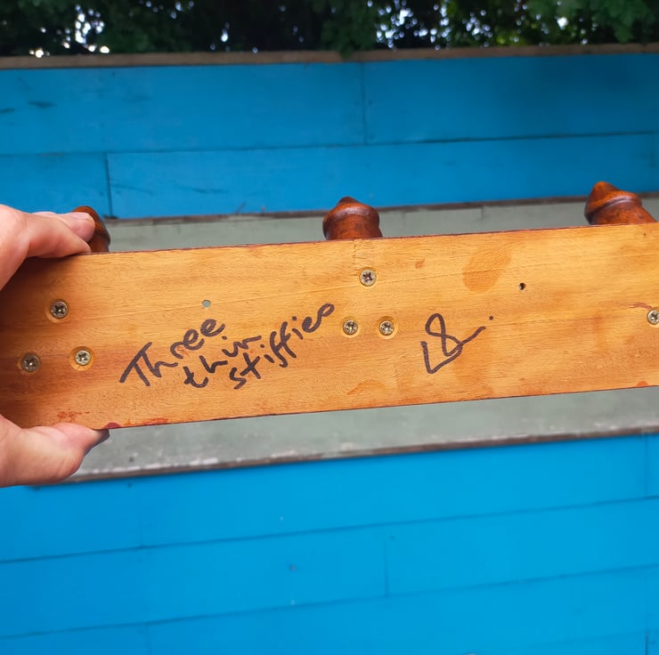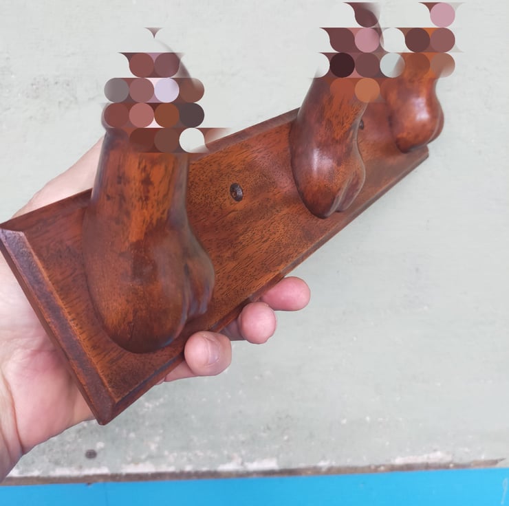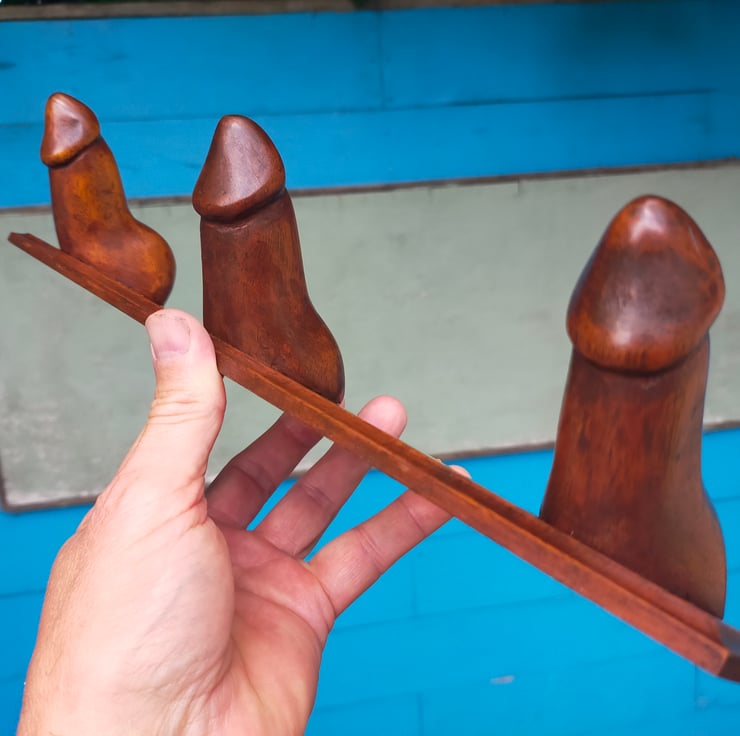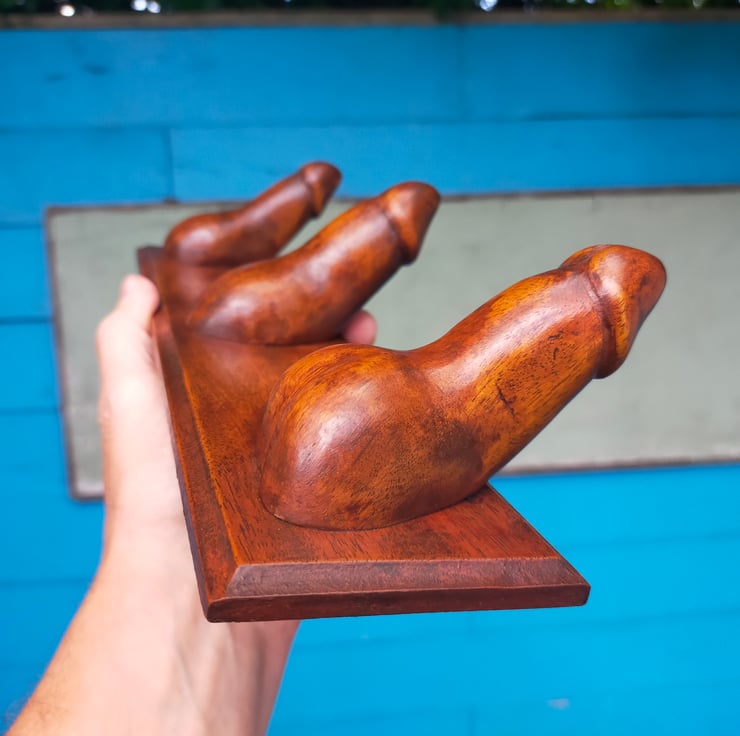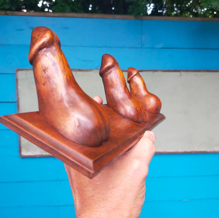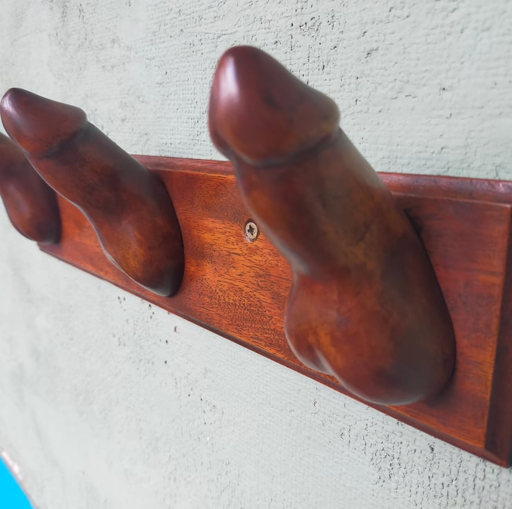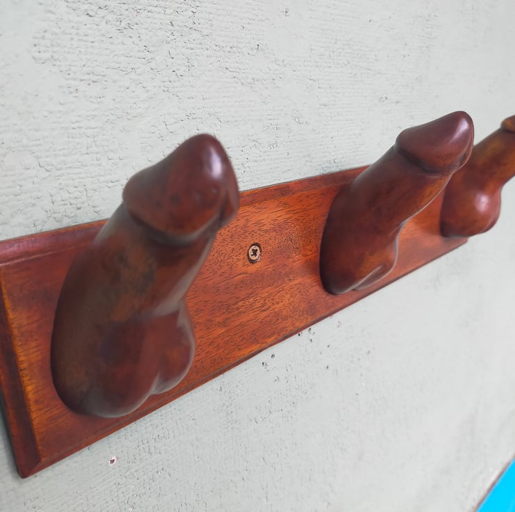 Want something a little more interesting to hang your dressing gown, bath robe or towel on? My novel hooks are designed for the bedroom or bathroom door of the more adventurous. Each appendage is individually hand-carved from reclaimed mahogany, sanded, stained, polished and waxed, and firmly screwed and glued to a mahogany backplate. The backplates are all different sizes as I have had to cut around the many nail holes in the original timber, so please do check dimensions carefully. The entire range of Choads, Packets, Stiffies and Shrooms is hand-carved from Brazilian mahogany - now a rare and protected timber - but reclaimed from a farm near Clitheroe, built in the 1950s. This timber served its purpose as the rafters of a barn, but is now living again as a limited run of cheeky household sculptures. As can be seen from the reverse pics, the timber is a light reddish brown but I wanted to create a darker and more distressed patina: I wanted these pieces to look like they had been recovered from an abandoned Victorian molly house. None is perfect: all have some flaw or other, and I have tried to highlight those in the photos. After all, if they were all identical how could you have a favourite? Each of this limited run has been named, numbered and signed by myself to make them even more unique.