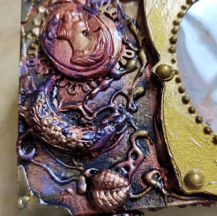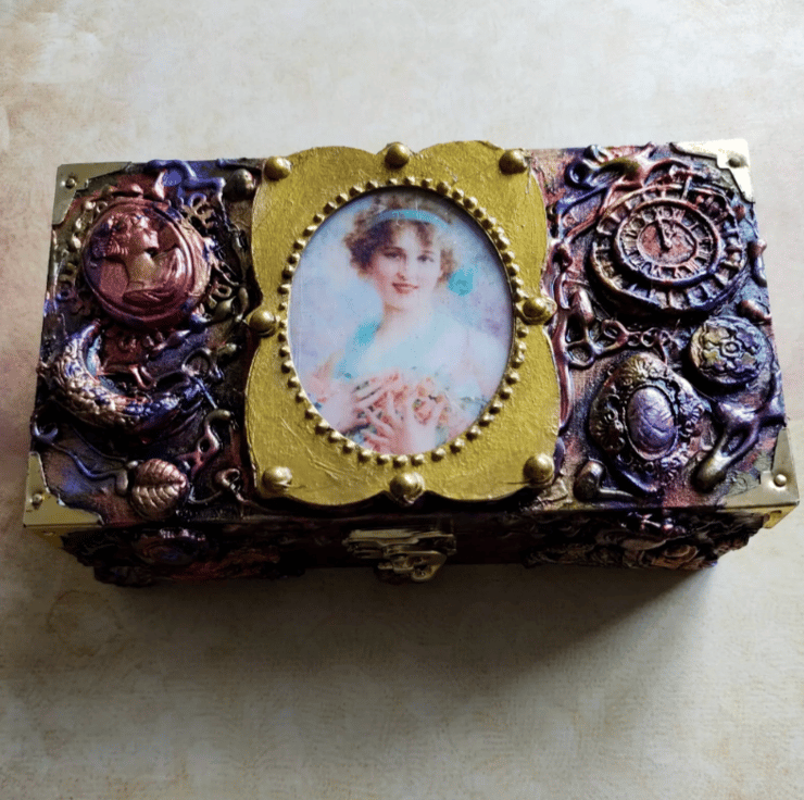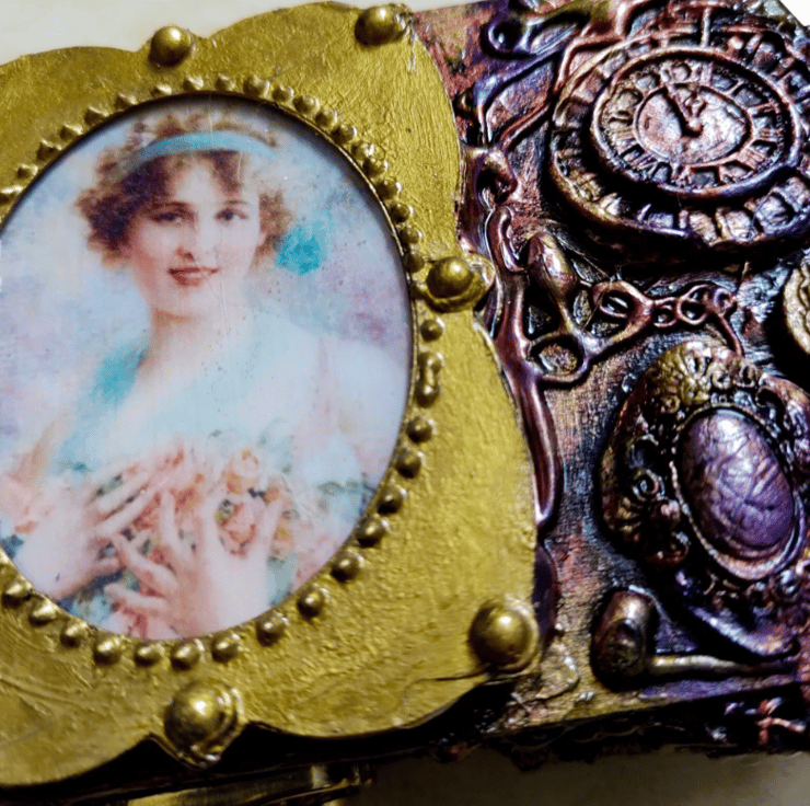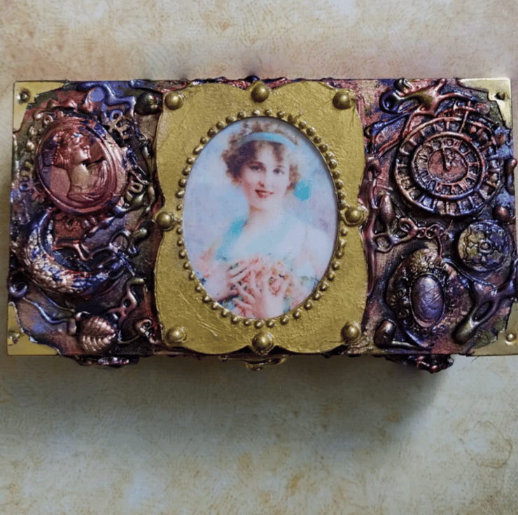 Beautiful 1800 era Lady with Flowers wooden Trinket box has been altered and decorated with different embellishments made from air dried clay. Then painted in coppers, gold, pinks, greens and purples The box has then been protected with varnish. The frame for the lady’s portrait has been designed by me and the lady herself has been set in Resin. One of a kind altered Trinket box. Please note that I have left the inside of the box unlined but painted in the same colours as the outside of the box.