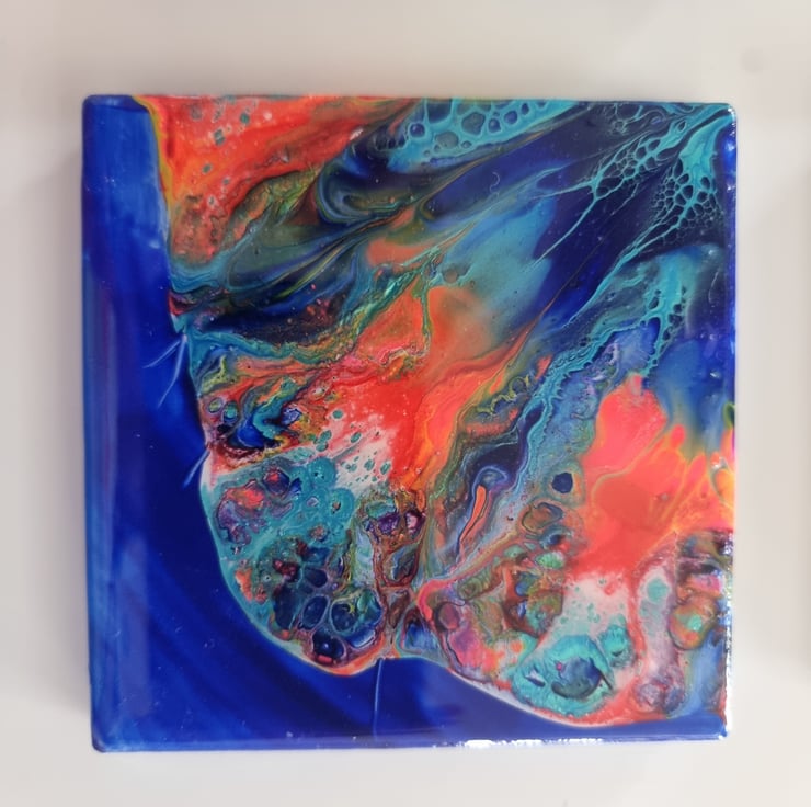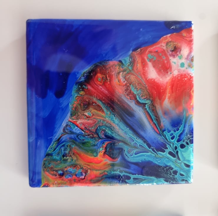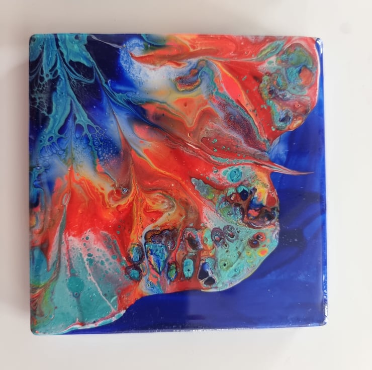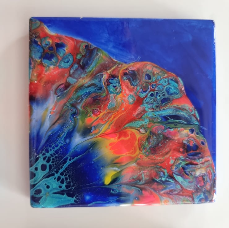 This is a unique opportunity to own a set of four Ceramic Coasters, created as a single design using Acrylic Paints and crafted using various Fluid Art techniques. The Never-to-be-repeated design is finished with two coats of heat and UV-resistant varnish.