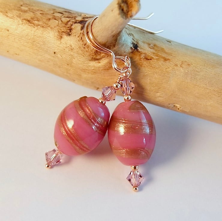 Each drop earring features a handmade glass lampwork 15x10mm oval bead, bracketed with quality Austrian crystal bicones in the colour 'light amethyst' and tiny 1.8mm rose gold vermeil spacers.