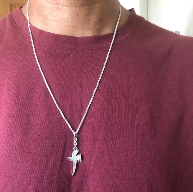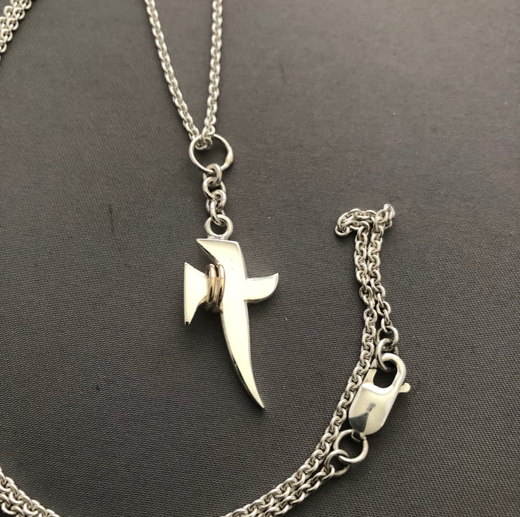 This is a solid sterling silver & 9ct gold cross pendant and chain, this pendant has two 9ct gold rings soldered on the pendant, weight of the pendant is 3.8 grams, the chain weighs 7.8 grams, and chain length is 22 inches long, chain comes with the pendant.