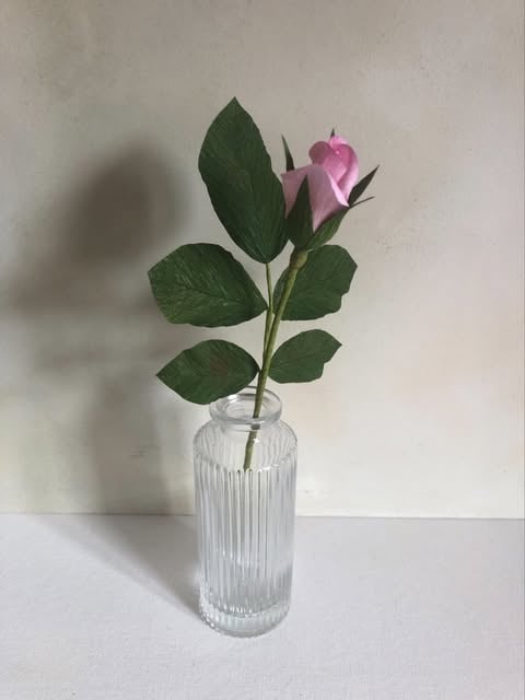 The rosebud's petals are created with hand painted crepe paper, accentuated by hand painted deep green crepe paper leaves.