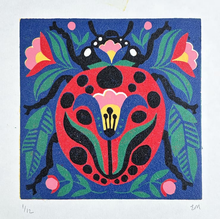A decorative ladybird surrounded by vibrant folk art nature motifs. Based on Ukrainian and Eastern European folk art. This is 3rd time lucky for me and reduction printing. I was inspired to try it out after deciding to submit some artwork to the Miniprint Cymru/Wales open call. Happy to say it got in!