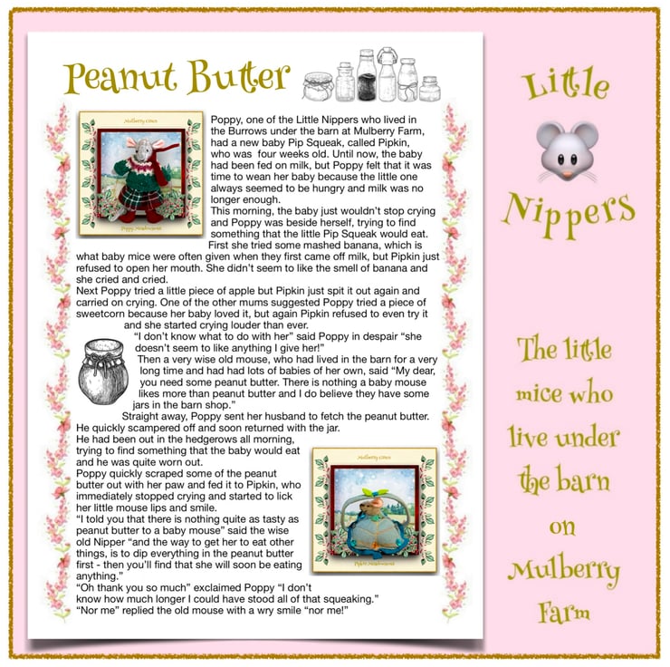 Little Nippers are a whole community of tiny wood mice, who live in a maze of little burrows and passages underneath the floor of the barn at Mulberry Farm. They are sometimes very hard to spot and Maisy and her friends rarely see them - but they are always there. The tiny mice all have their own cosy little cottages inside the burrows and work very hard in the fields, gathering seeds and berries, tiny fruits and bits of grain to take back to the burrows to be made into food. They even have their own little barn shops, where they can share the things they find in the fields and get the food they need to look after their families. They are a very happy little community who all take care of each other. There are also baby Nippers, who are called Pip Squeaks - these are very small and are not removable from their sleeping bags.