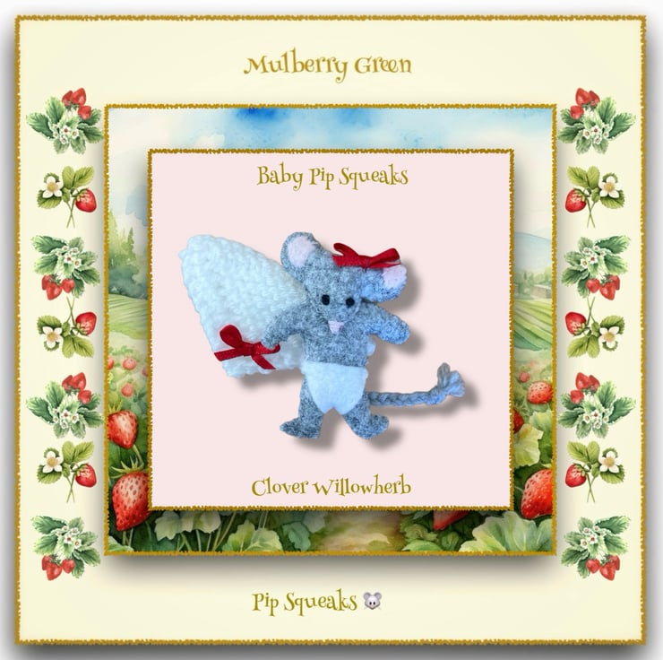 Clover Willowherb, with her little hand-knitted blanket, is a Little Nipper baby mouse - tiny mice who live in a maze of tunnels underneath the barn at Mulberry Farm. All of the Little Nippers are named after herbs or meadow flowers. Baby Pip Squeaks are very tiny - just 6cm tall.