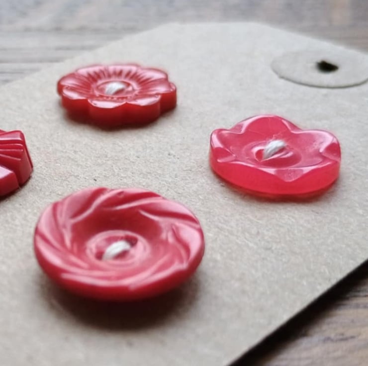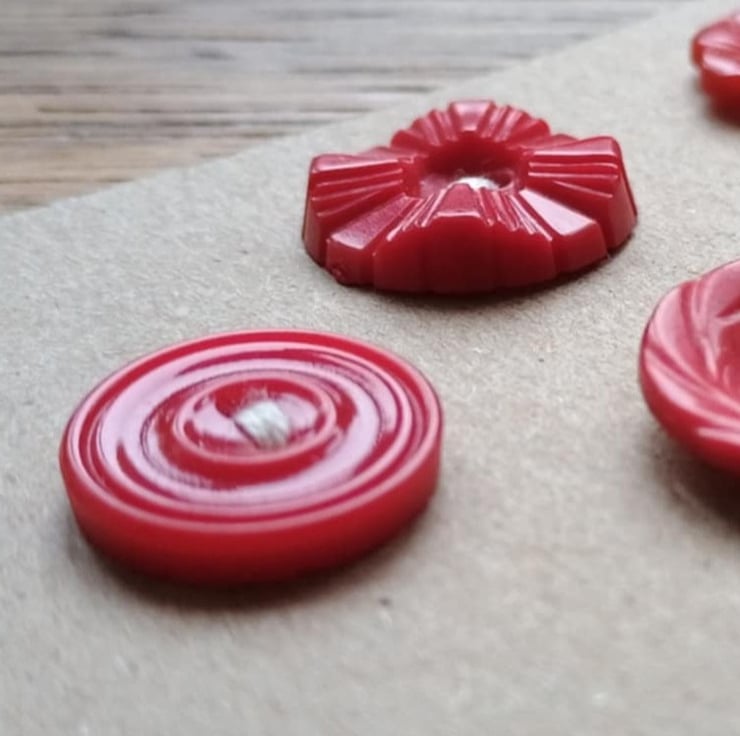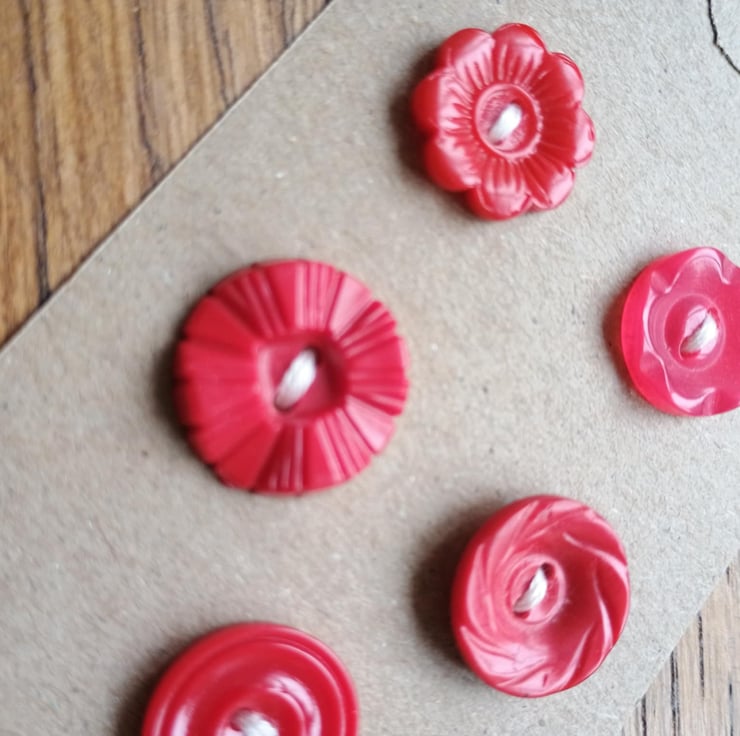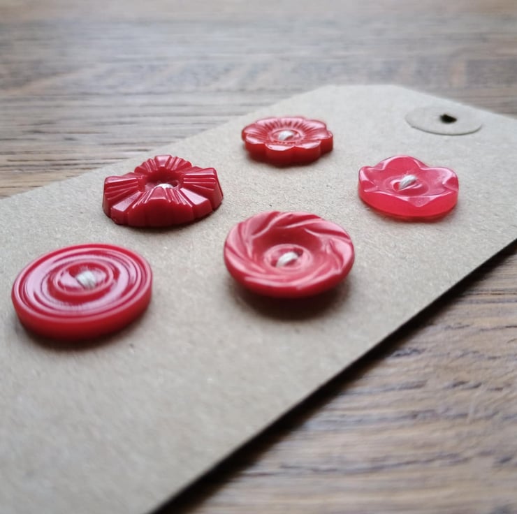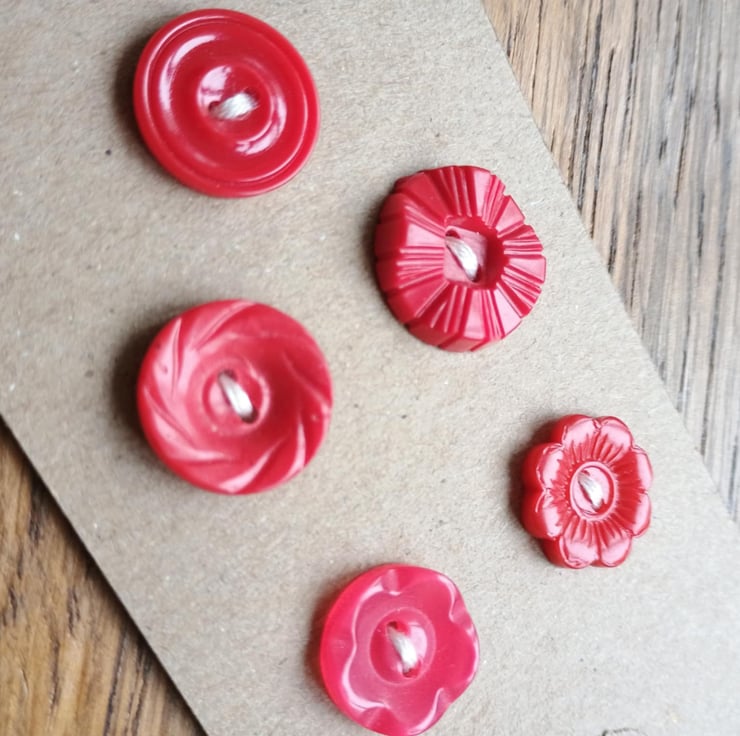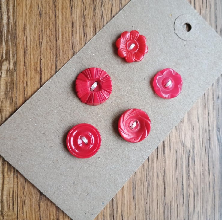 5 little red buttons - retro style! With beautiful moulded detailing, these would be lovely as mis-match fastenings on a cute jumper or dress. Or as accents in your hand crafting. Ideal for Christmas or Valentine, but beautiful all year round.