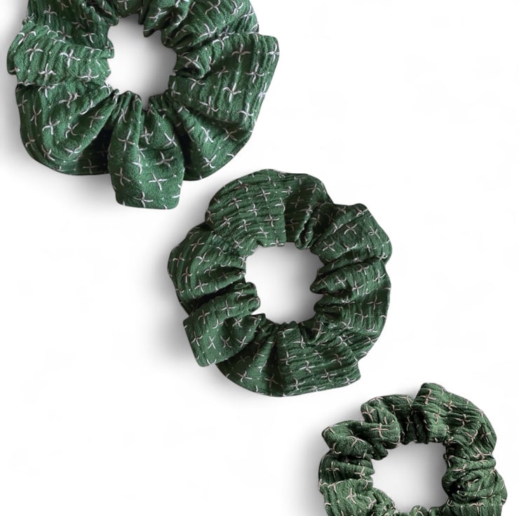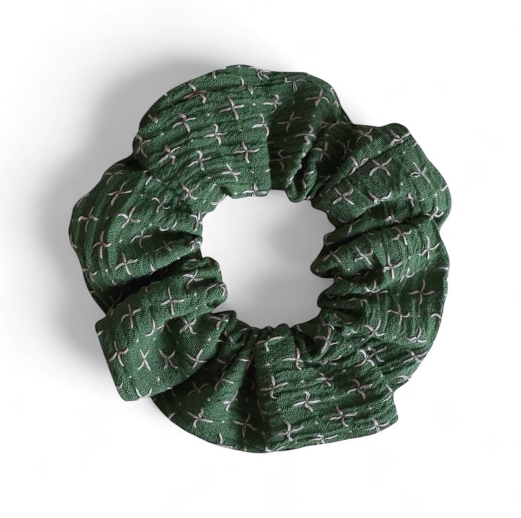This scrunchie is crafted from a dark green organic cotton, beautifully detailed with delicate pink cross-stitches. The fabric has a textured, slightly rustic feel, evoking handmade charm and timeless, earthy elegance. It’s lightweight yet sturdy, holding its shape comfortably in your hair or on your wrist.