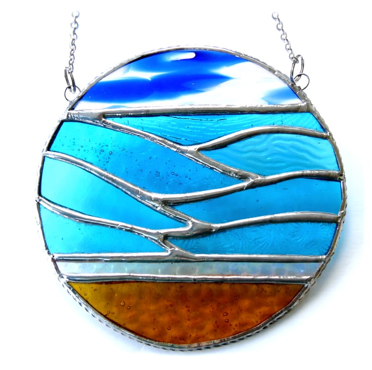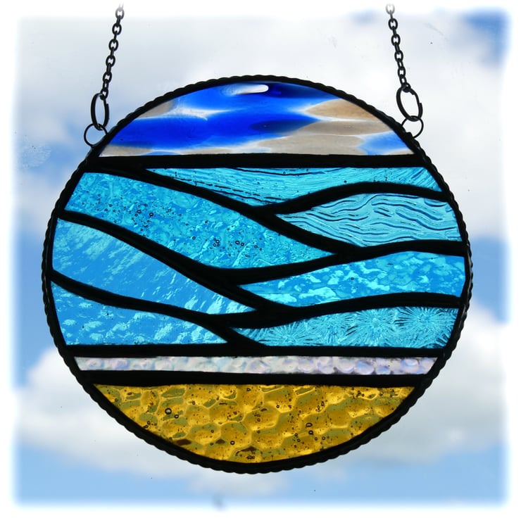 I've used the same elements of a golden sandy beach, a line of iridescent crystal waves under pretty turquoise waves. For this version the sky is bright blue with scudding white clouds. Perfect for a day at the seaside.