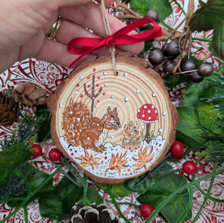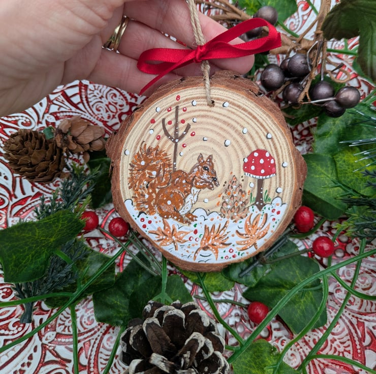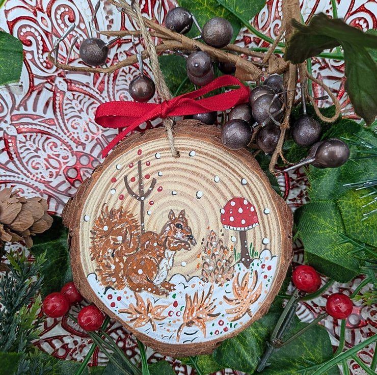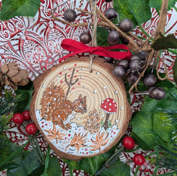 A sweet hand-painted Squirrel log slice Christmas decoration. This beautiful squirrel ornament has been lovingly hand-painted in acrylics and varnished with a gloss varnish.