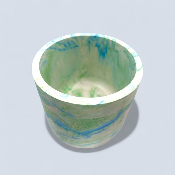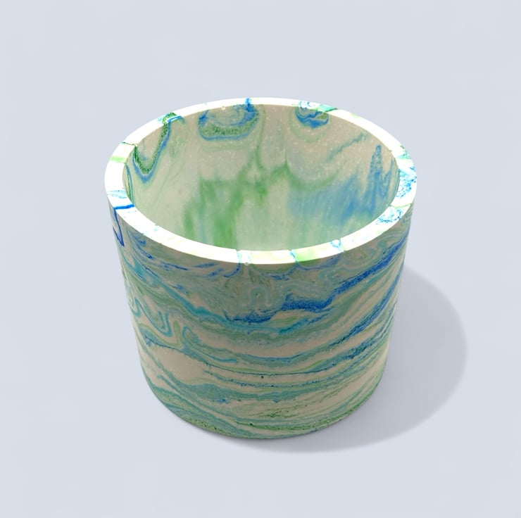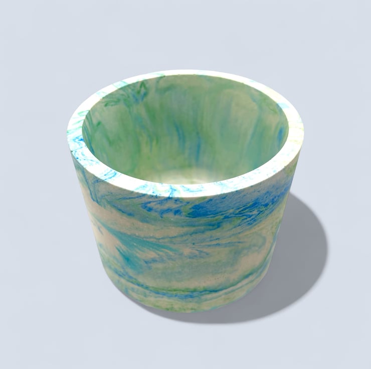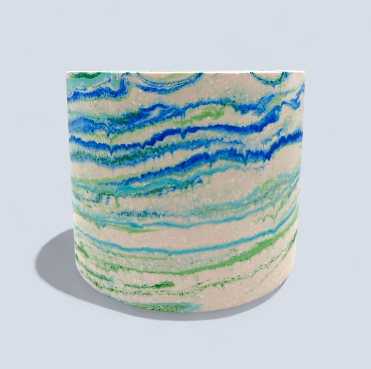This plant pot features a beautiful marbled effect in shades of green, blue, and turquoise inspired by seascape colours. Using a few drops of glitter green pigment, I created patches with a subtle shimmer to add extra interest. It is handmade from Cassini, a material commonly used in marble and stone restoration and repair. It features a smooth, luxurious texture similar to marble and is water—and weather-resistant.