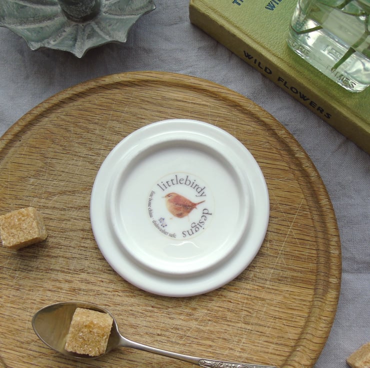 Hand decorated using ceramic transfers of my watercolour illustrations of a hare with a yellow primrose and lilac crocus flower. My illustrations are professionally printed onto ceramic transfers which I cut and apply by hand to each coaster. They have a slight rim so are also equally suitable to use as a spoon rest.