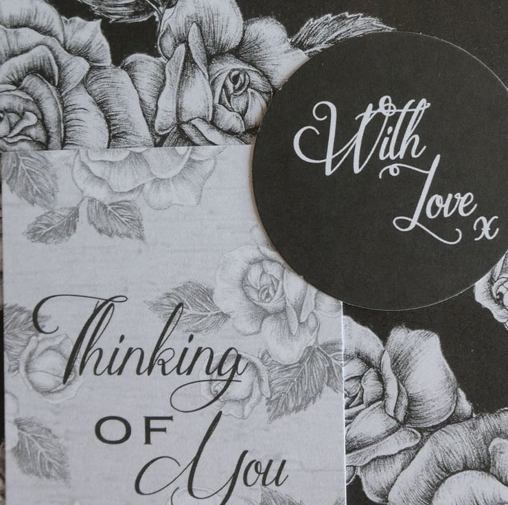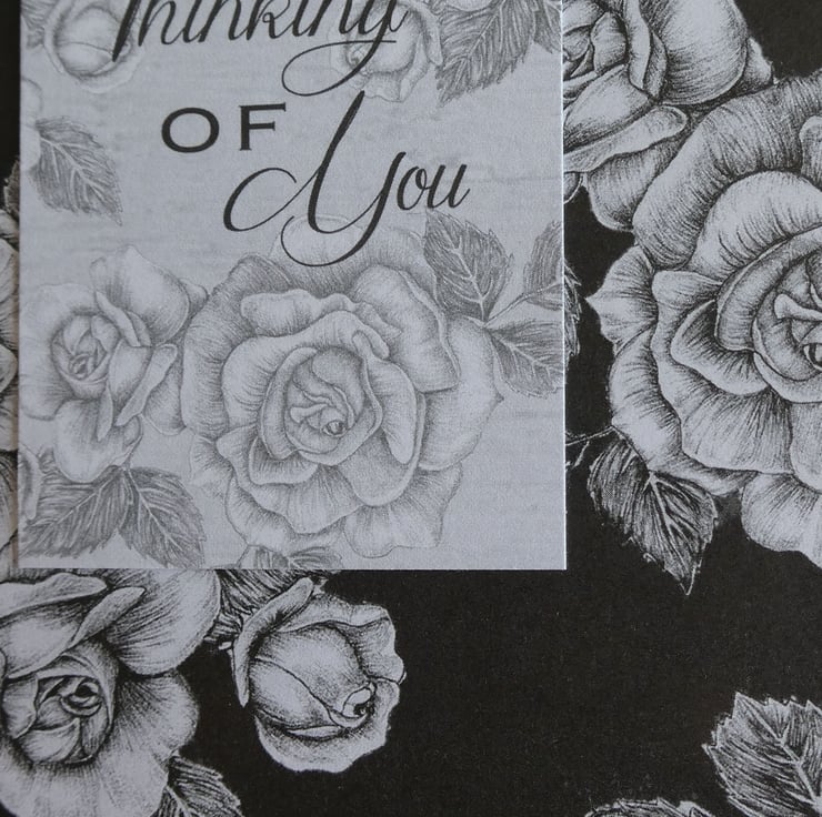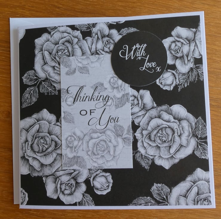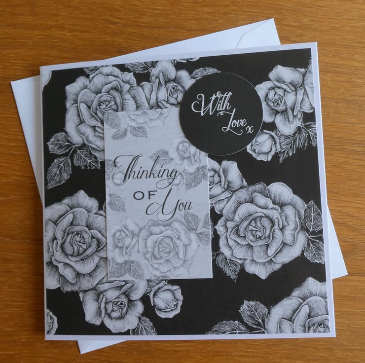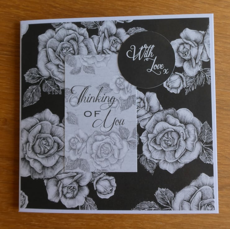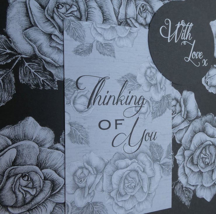 This thinking of you card has a monochrome rose design in black, grey and white with the messages Thinking of You and With Love x.