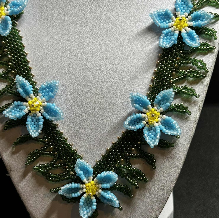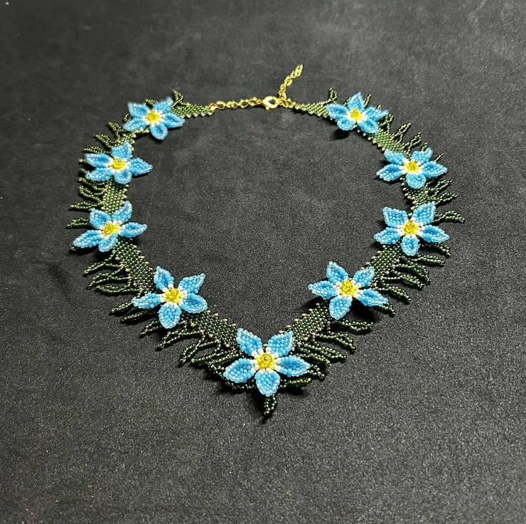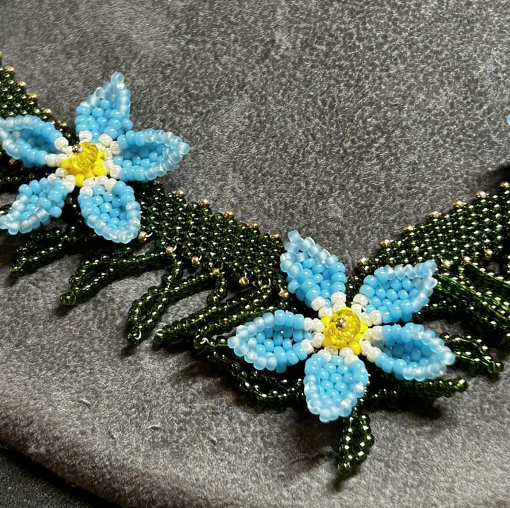 This is a very time-consuming piece, but I wanted to make something delicate yet striking. Each flower is handmade using a brick-stitch technique, while the V neckline is constructed using Peyote stitch.
