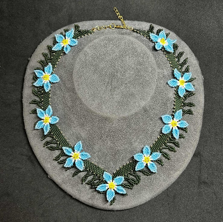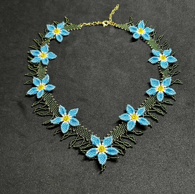 Each flower is highlighted with a beautiful yellow crystal, and I designed the pattern to look as much like Forget Me Not flowers as possible.
