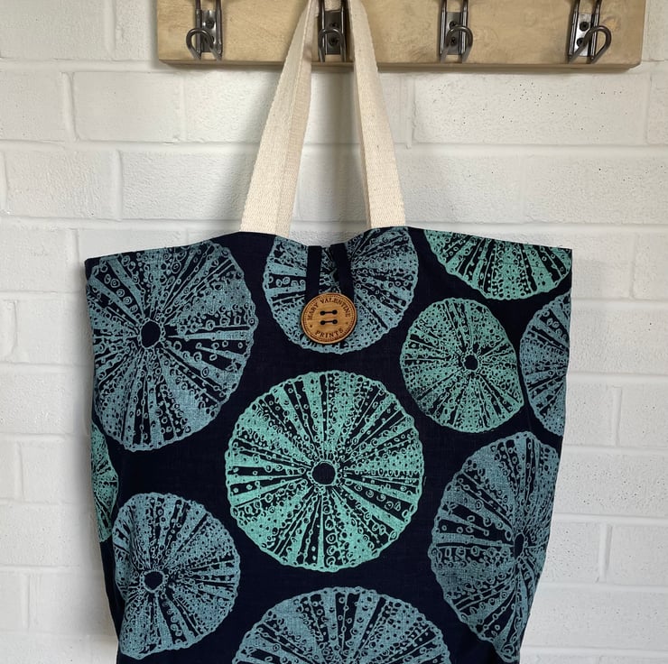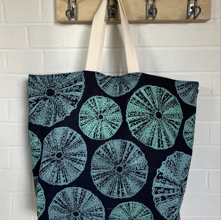 I’ve handprinted the fabric for these bags using my own sea anemone design, inspired by some shells that I found on Holkham Beach in North Norfolk.