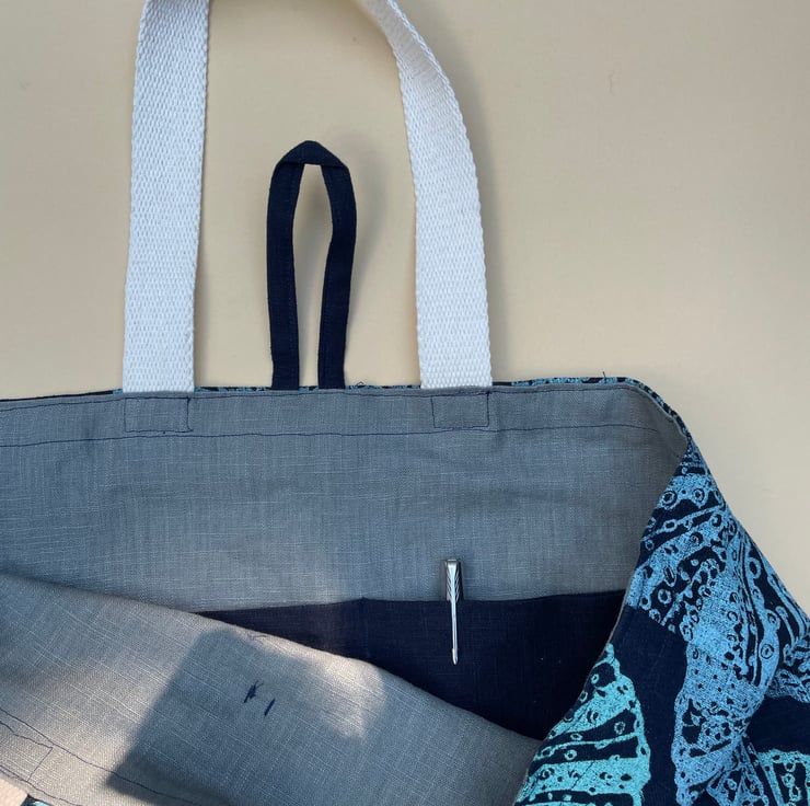 I’ve hand made the bag using a soft cotton denim and securely attached natural handles. It has a cotton lining and an internal pocket with two compartments suitable for phones, pens, notebooks etc.
