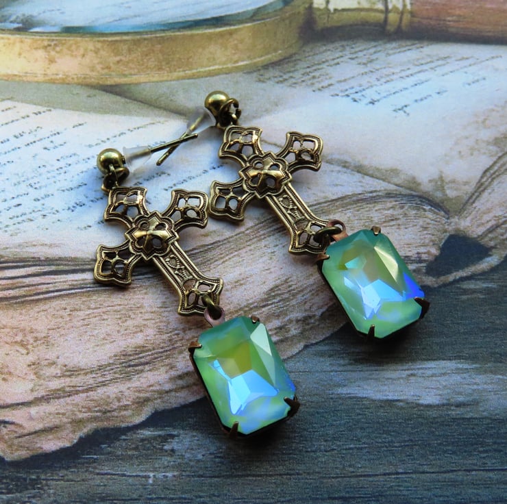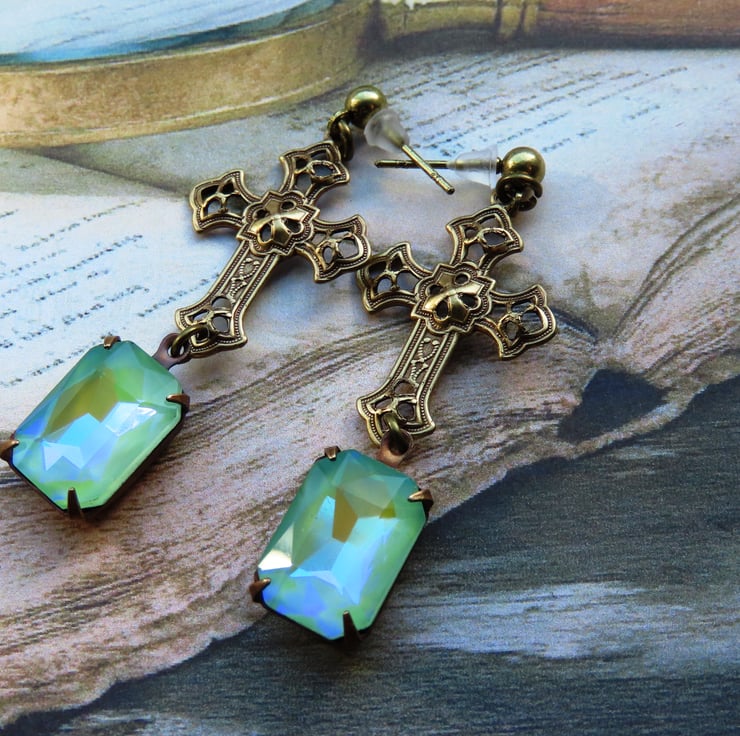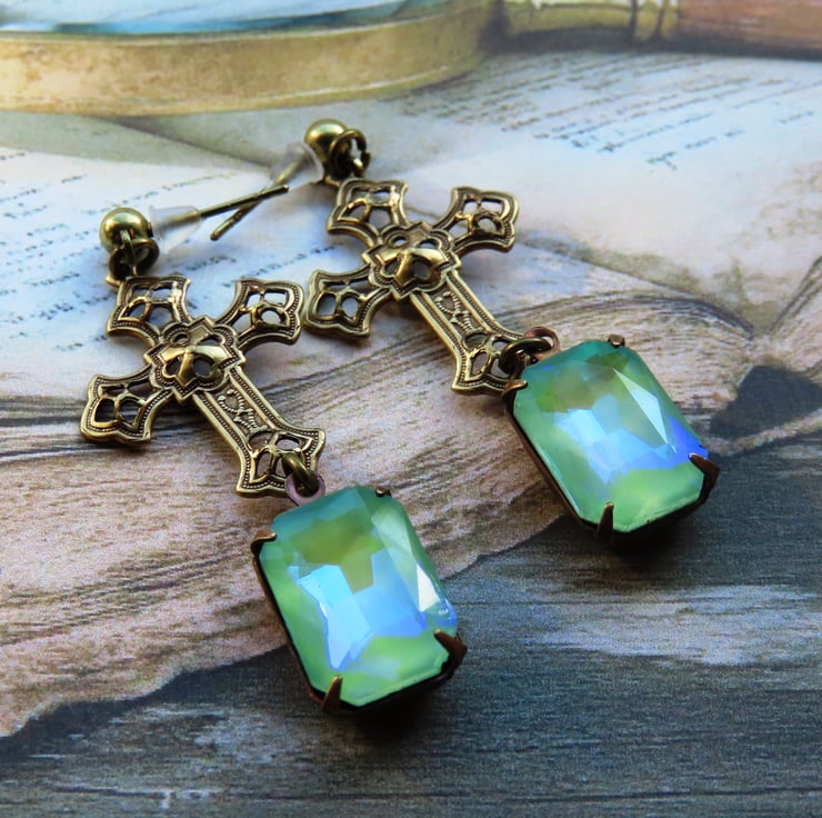 These 14 x 10mm crystals are set in antiqued brass and dangle from beautifully detailed antiqued brass Celtic style crosses.
