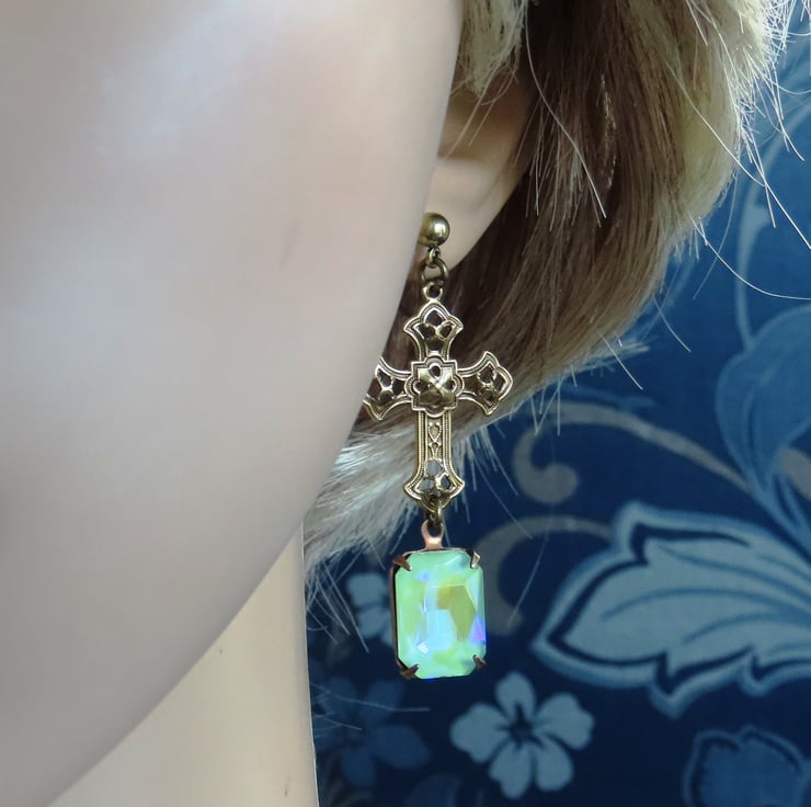 Ornate Celtic Cross dangle earrings featuring gorgeous Mystic Green Opal Octagon Crystals.