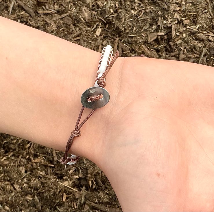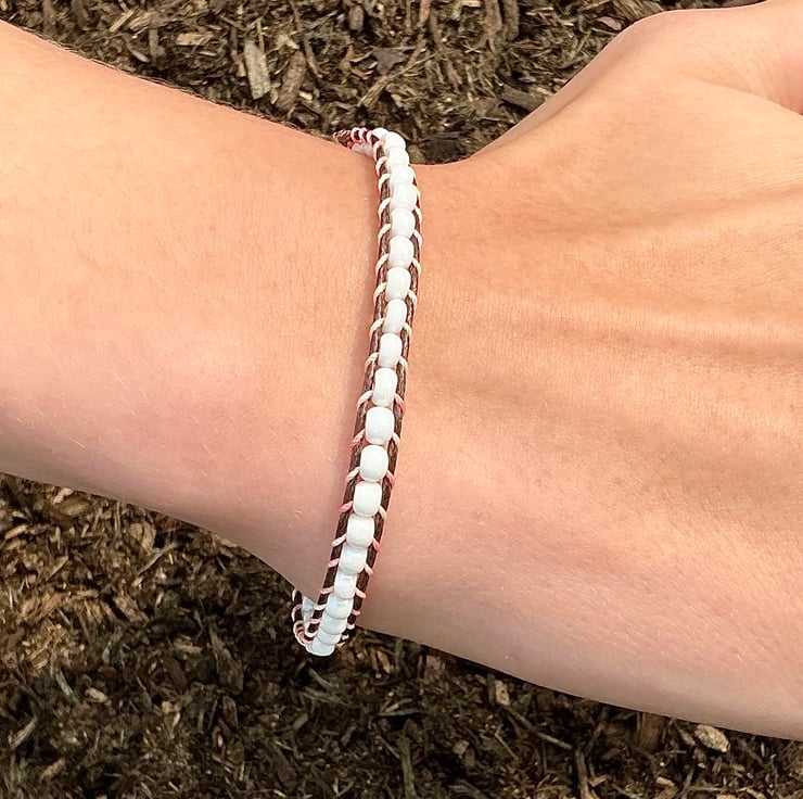 This bracelet has been made with glass seed beads, that have been knotted onto cord.
