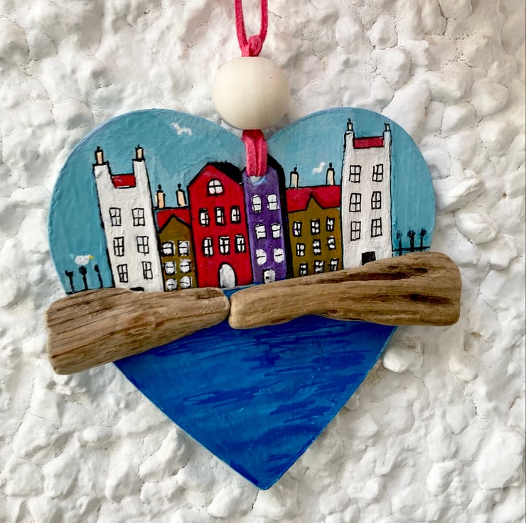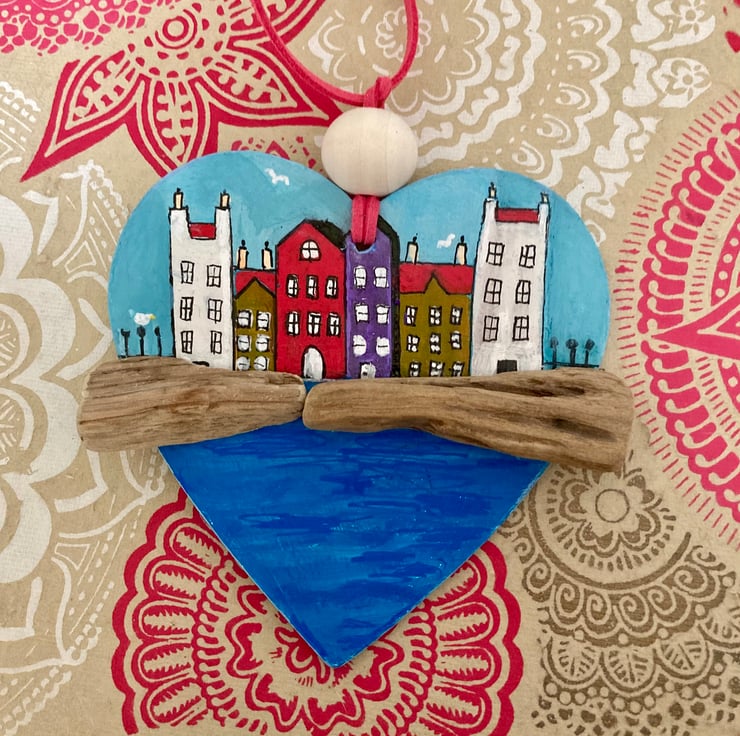 Harbour Houses On Driftwood Heart Hanging Decoration Hand Made Decor & Gifts