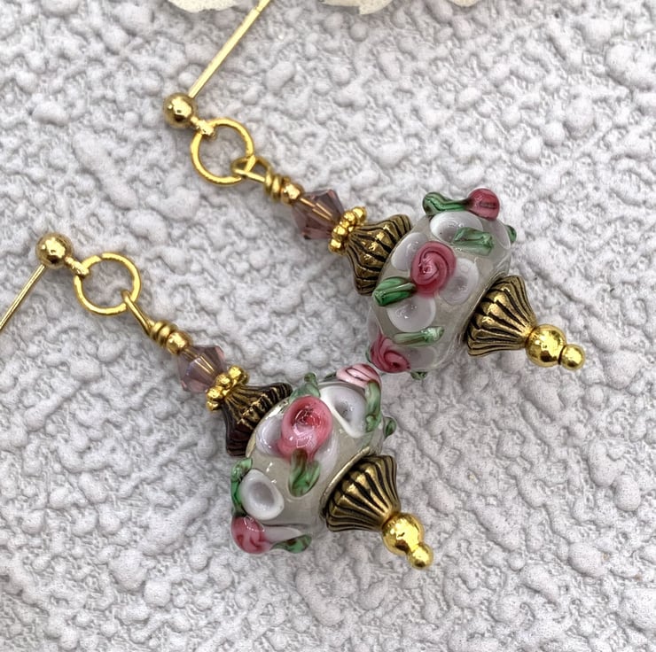 These stunning earrings are made with patterned Venetian Murano glass beads which have a highly raised design of pink roses running around the edge of the beads.