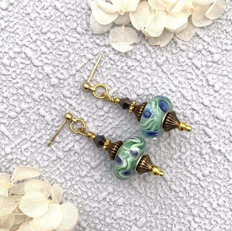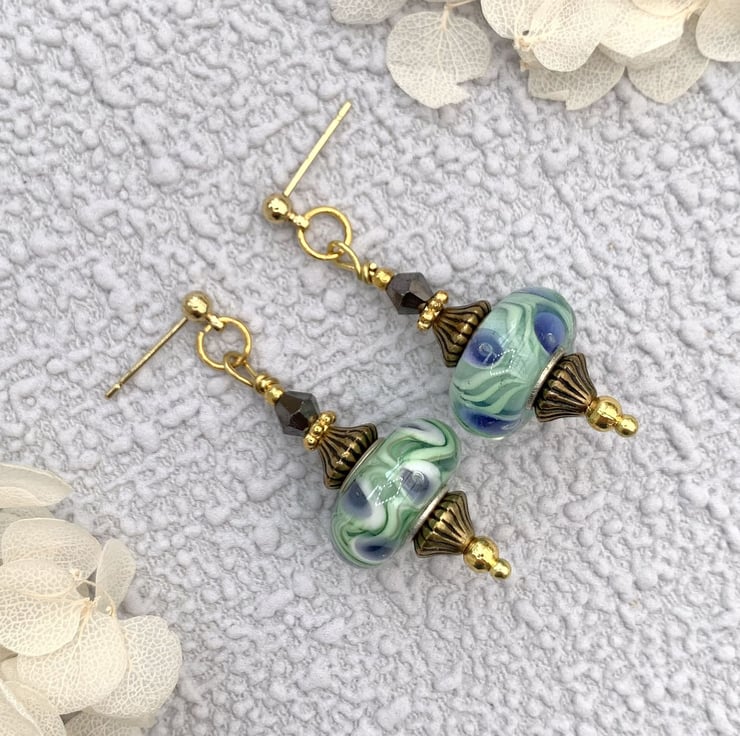 These pretty earrings are made with patterned Venetian Murano glass beads which are pale green and have blue and white swirl patterns running through the glass.