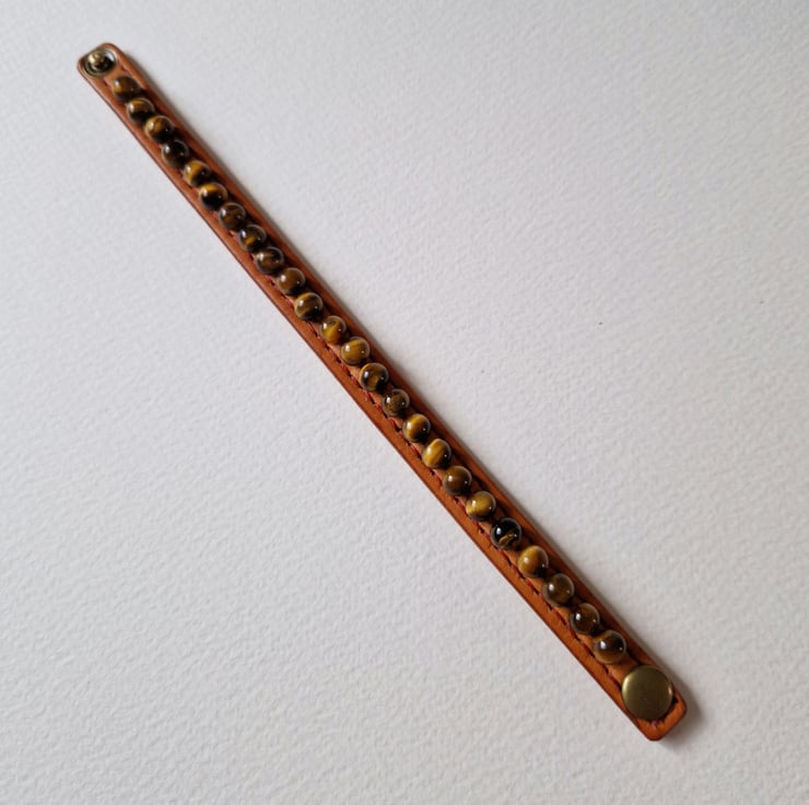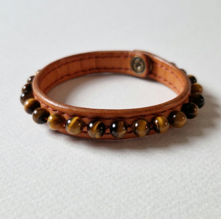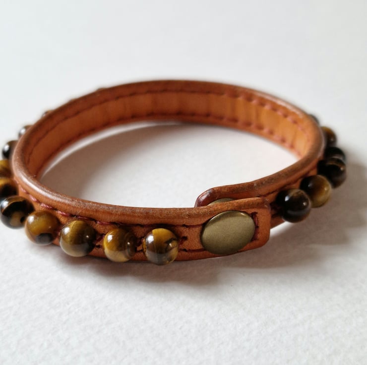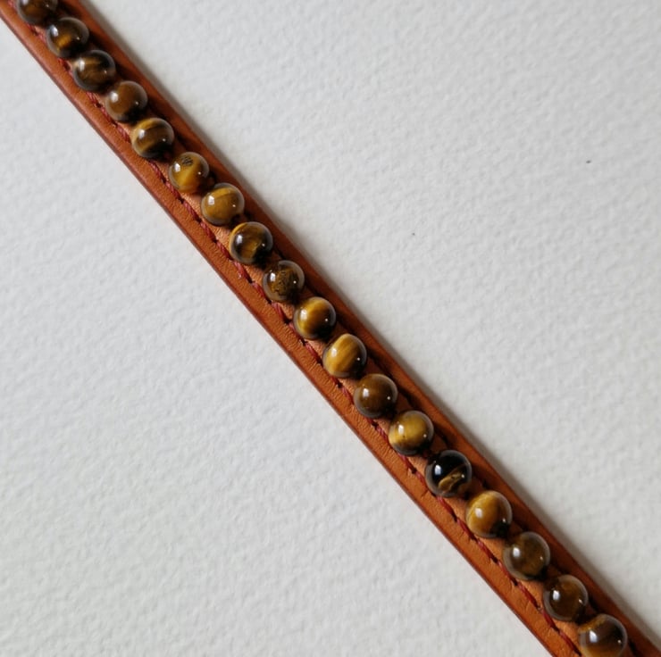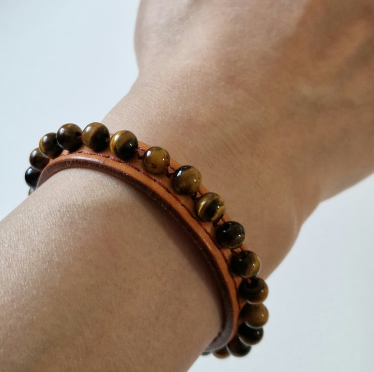 Handmade Leather Bracelet with Tiger's Eye Beads – Handstitched, Double-Layered