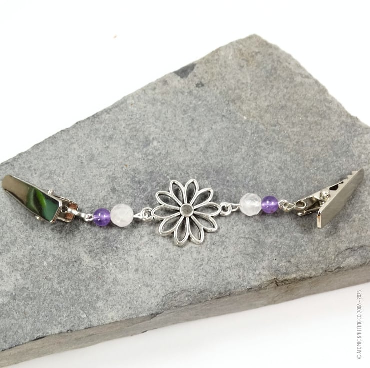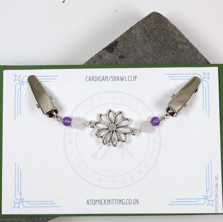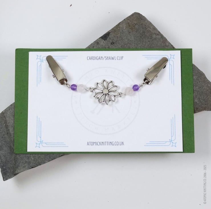 Cardigan Clip with Rose Quartz, Amethyst & Silver Flower Pendant