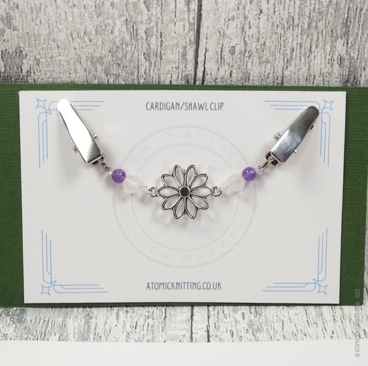 Add a touch of elegance to your outfit with this unique cardigan clip, handcrafted with faceted rose quartz and amethyst gemstone beads, and finished with a delicate silver flower pendant. Strung on silver wire and fitted with silver-colour clips, it’s both beautiful and functional.