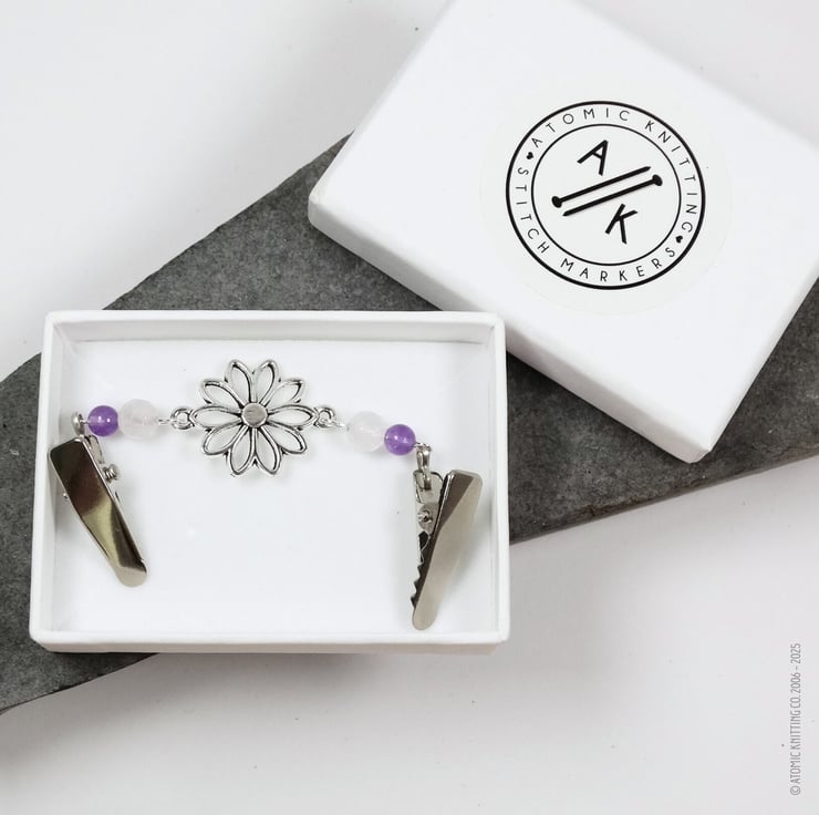 Designed and made in the UK by Atomic Knitting. Custom hand made stitch markers, row counters, tools for knitting and crochet.