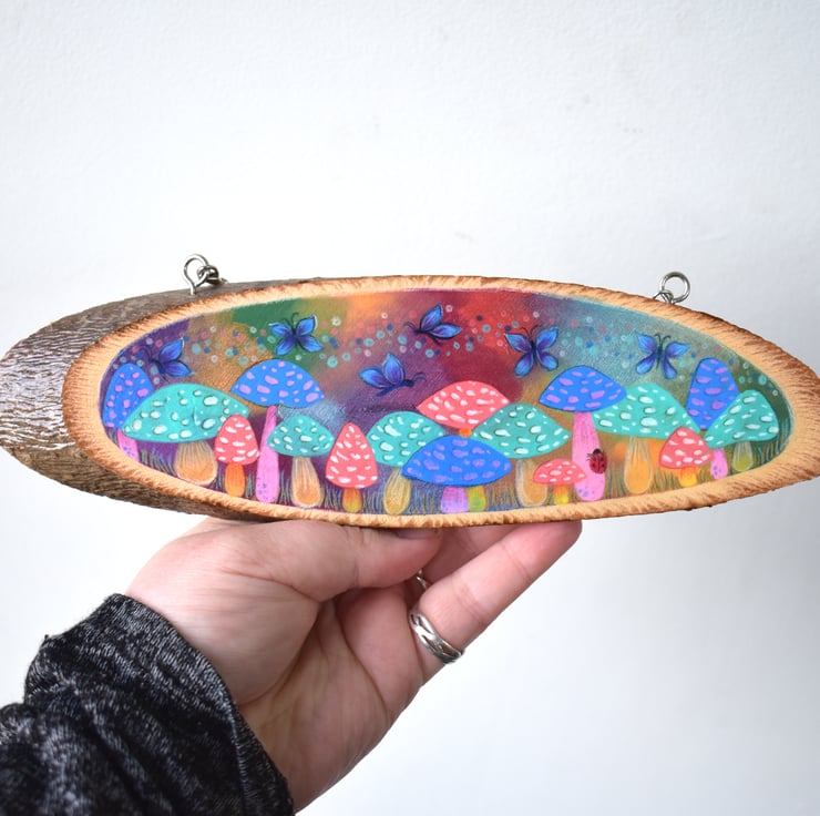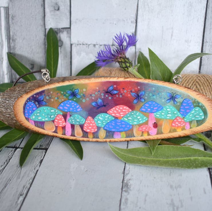 A beautiful wooden plaque with a hand painted fantasy toadstool garden design.