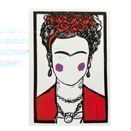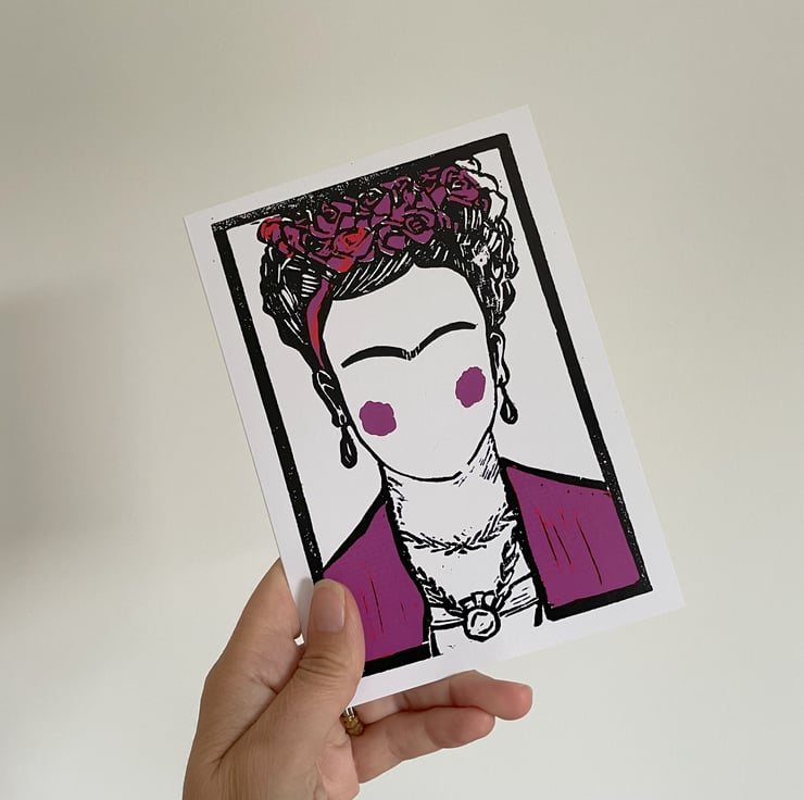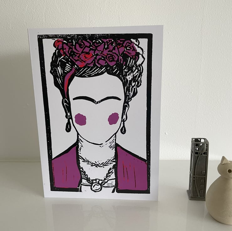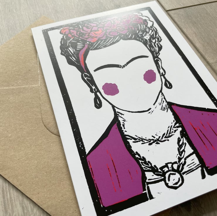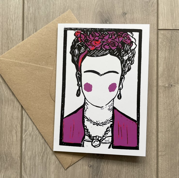 This card is a digital reproduction print of my original lino print design which depicts a stylised portrait of the iconic painter Frida Kahlo.