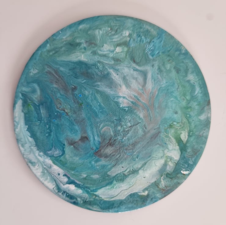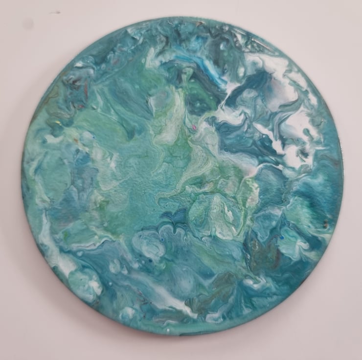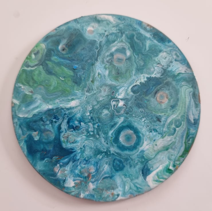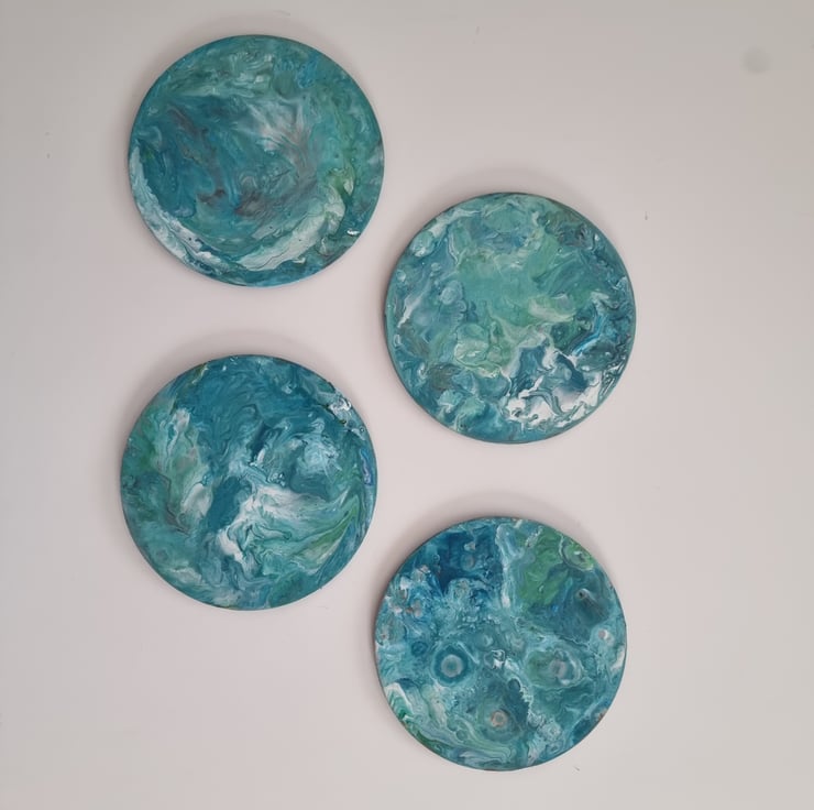 The four coasters have been designed primarily around the colour teal and the detail applied as embellishments after the Pour-and Tilt process. Two coats of Varnish have been applied for protection.