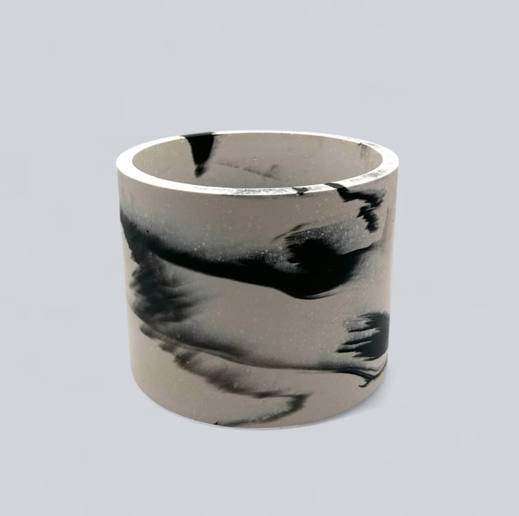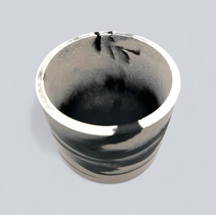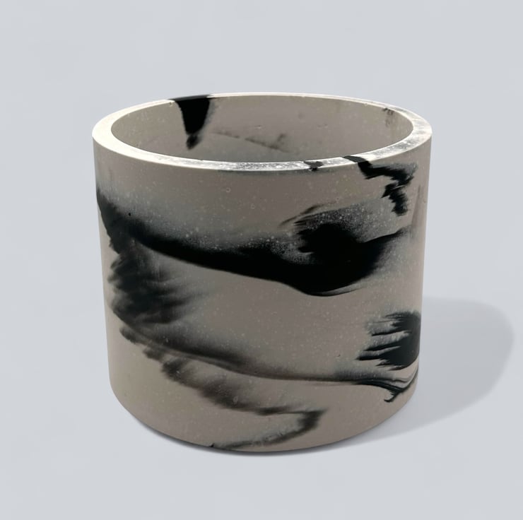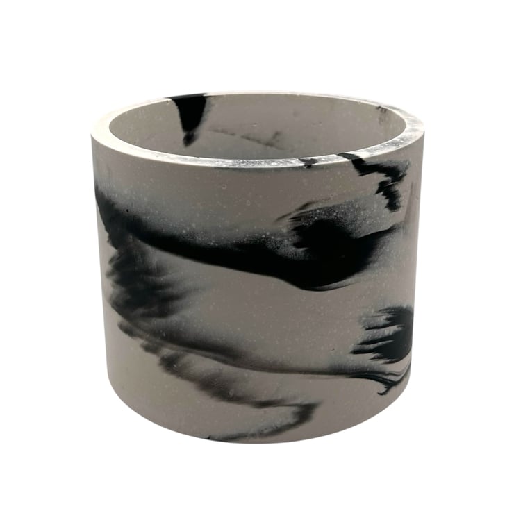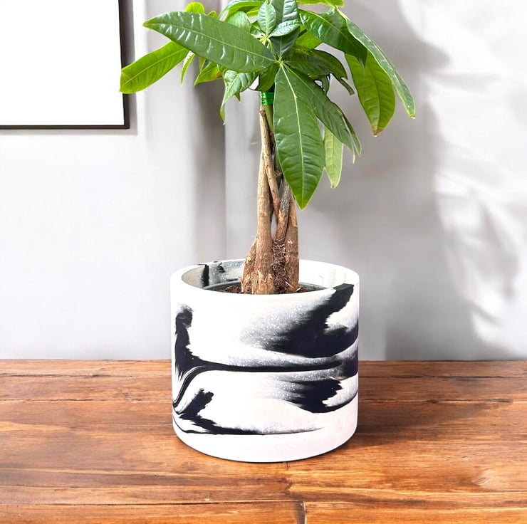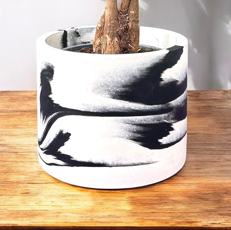This plant pot features a striking black-and-white pattern, with swirls of black against a white background. It is handmade from Cassini, a material commonly used in the restoration and repair of marble and stone. It features a smooth, luxurious texture similar to marble and is resistant to water and weather.